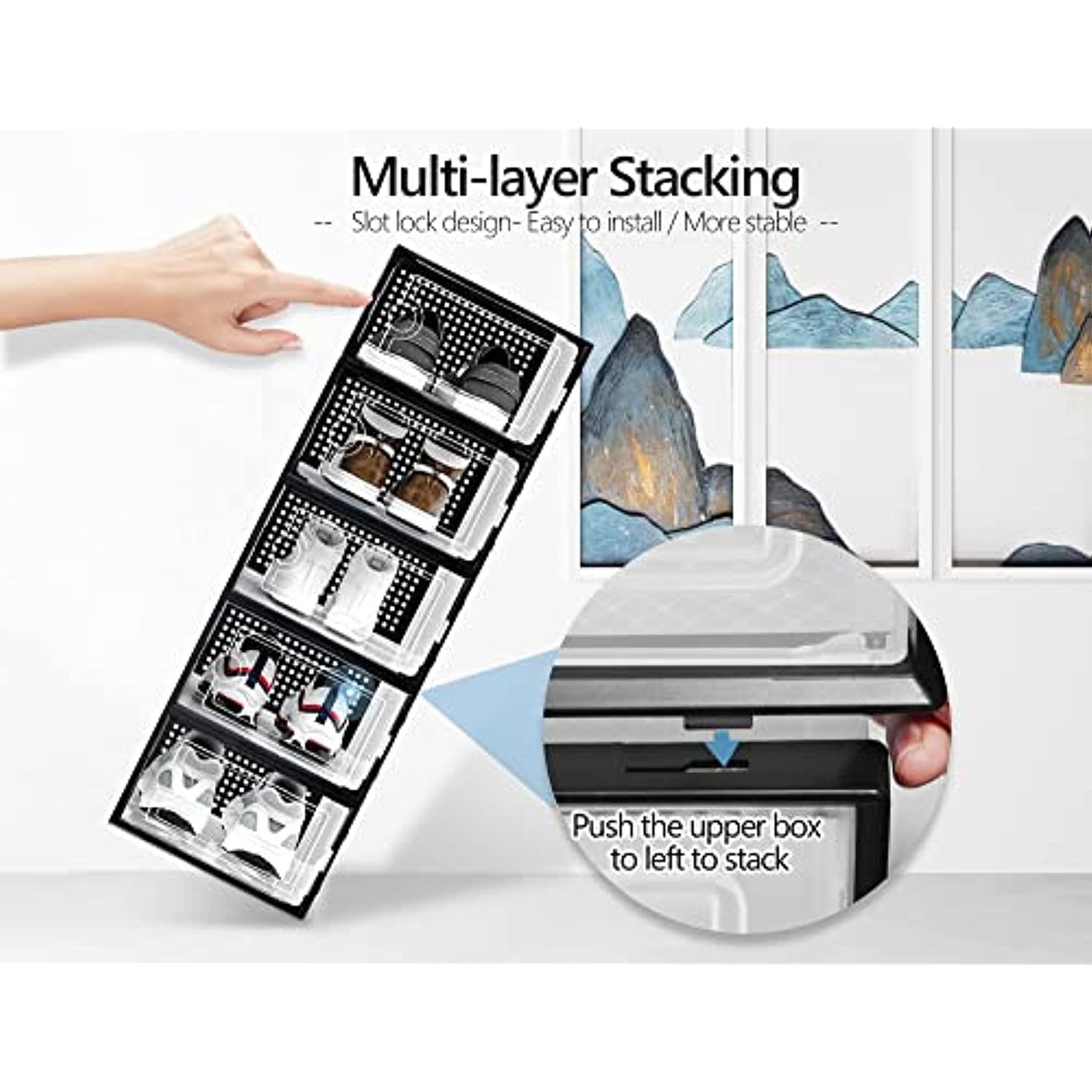 - Easy and Stable Stacking for Space-saving: Slot lock design makes it easy to stack the shoe boxes together. You only need to “Insert-and-push†to finish the stacking. This design makes the shoe boxes more stable for free combinations and easy to move.