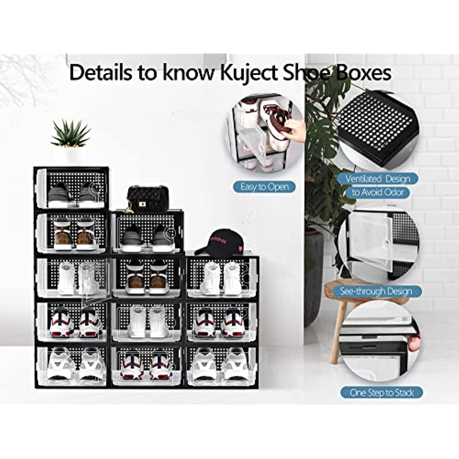Large Shoe Organizers Storage Boxes For Closet 12 Pack Kuject Clear Plastic Stackable Shoe Containers Bins With Lids Great Substitute For Shoe Rack Under Bed Shoe Storage For Entryway Drop Front Fit Up To Womens Size 12 Black