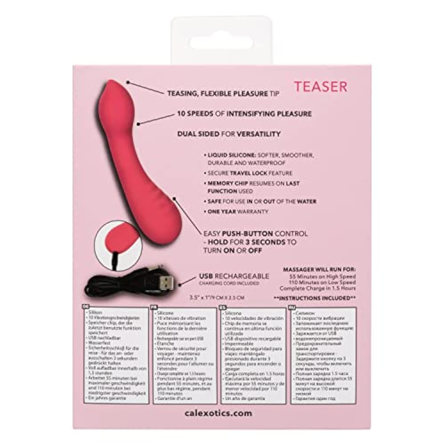 Versatile, Dual Sided Massager With Teasing, Flexible Pleasure Tip | | 10 Incremental Speeds Of Vibration | | Liquid Silicone: Softer, Smoother, Durable And Waterproof | | Memory Chip Resumes On Last Function Used; Security Travel Lock Feature – Hold For 3 Seconds To Turn On Or Off | | Usb Rechargeable – Charging Cord Included; Complete Charge In 1.5 Hours; Runs For 55 Minutes On High Speed And 110 Minutes On Low Speed; 1-Year Manufacturer | |
