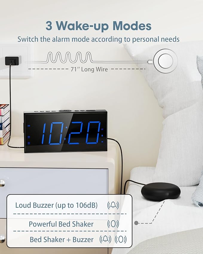 - ⏰【Wake by 𝗦𝘁𝗿𝗼𝗻𝗴 𝗕𝗲𝗱 𝗦𝗵𝗮𝗸𝗲𝗿 & 𝗟𝗼𝘂𝗱 𝗕𝘂𝘇𝘇𝗲𝗿】- Differ from regular alarm sound clock, our 𝗹𝗼𝘂𝗱 𝗮𝗹𝗮𝗿𝗺 𝗰𝗹𝗼𝗰𝗸 comes with 3 innovative alarm methods: loud buzzer, super bed shaker or both sound and shaker, actually make it easier to wake you up from deep sleep. Simply press the “BUZZ/VIB” button to choose your favorite wake-up modes for maximum impact. The bed shaker alarm clock is also a perfect option for heavy sleepers, hearing impaired, deaf or hearing loss.