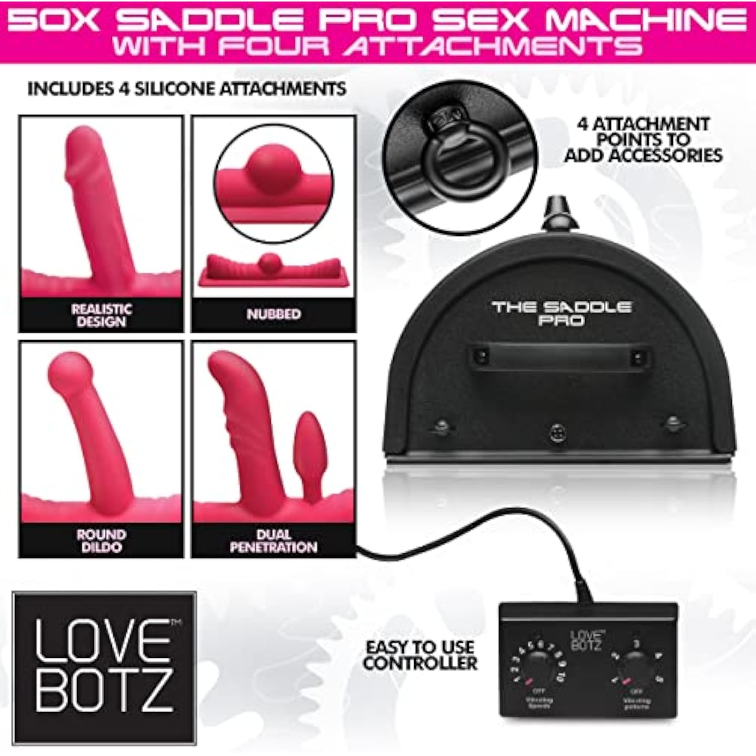 Love Botz 50X Saddle Pro Sex Machine With 4 Silicone Dildo Attachments, Vibrating Thrusting Dildo Mount For Men, Women, & Couples, Powerful & Durable Adult Toys, Easy To Use, 5 Piece Set, Black