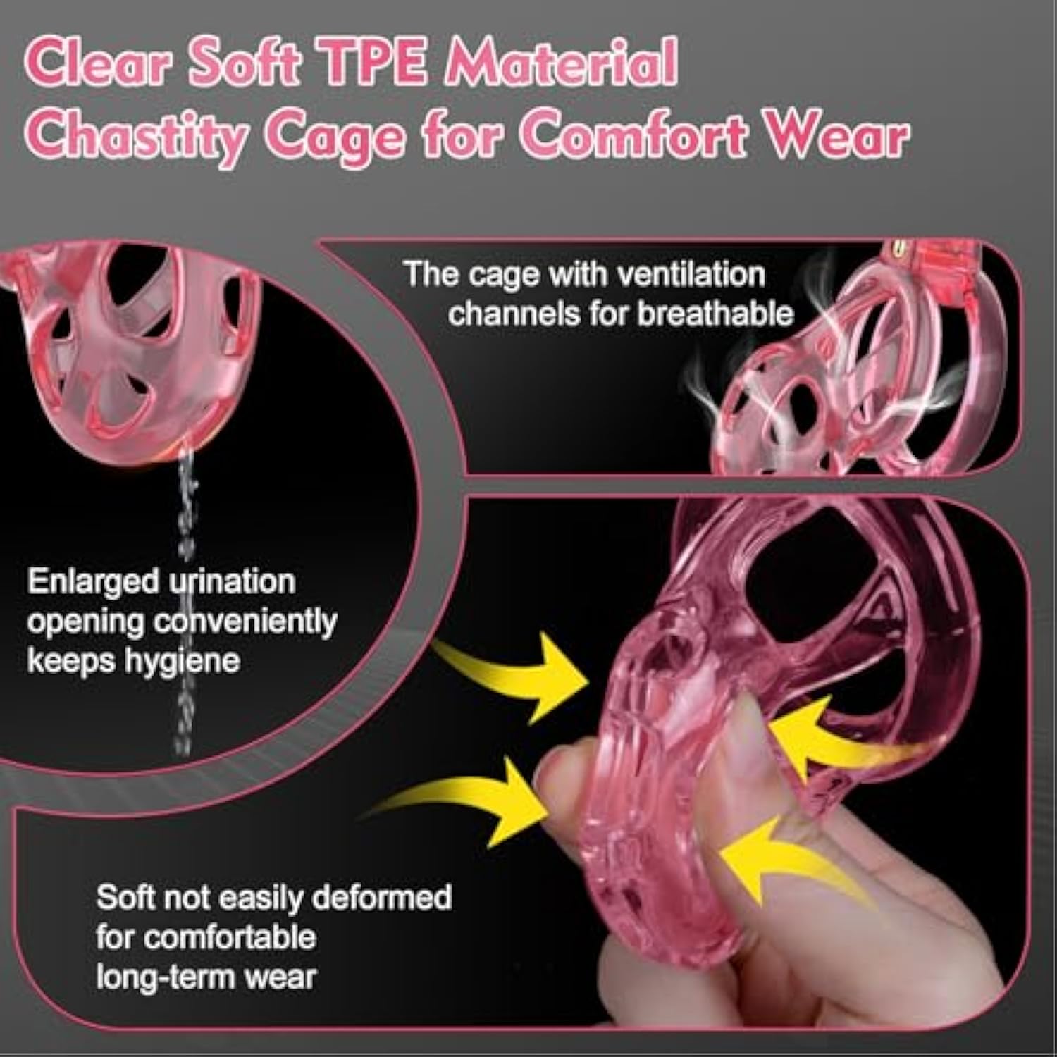 | Soft Chastity Cage Design For Comfort: The Cage’S Soft Body Design Fits Over Your Unit, Restricting Your Erection In A Cage Of Clear, Flexible Tpr. A Loop Around The Testicles Keeps The Cage On And Secure, No Matter What You Get Up To. Enjoy Being “Locked Up” During Bondage And Role-Playing Games | | Hollow Breathable Male Cage: Vents At The Sides And An Open Tip Make It Breathable And Allow You To Use The Restroom In Comfort Without Taking Off The Cage. Experiment With The Cage During Kinky Games, Or Settle In For Long Control Sessions With Its Vented And Open-Tipped Design And Xperience The Ecstasy Of Total Surrender | | Two Types Of Chastity Locks: Choose The Suitable Ring And Keep The Cage Securely On, You’Re Free To Focus On Your Partner’S Pleasure Or Enjoy The Amazing Feel. Traveling Or Attending A Party, Switch From The Padlock To The Flexible Plastic Tie Locks And You’Ll Be Able To Sport Your Cage Incognito. (Includes 6 Ball Rings: 1.57", 1.73", 1.89", 2.05", 2.2", 2.36") | | Ideal For Bdsm Bondage Enthusiast: Experience The Feel Of A Restricted Erection In A New Way. Whether You’Re A Newcomer To Male Chastity Devices, Or You’Re An Experienced Player Looking For A Device With Fun And Flexibility, The Chastity Cage Makes An Incredible Addition To Your Pleasure Arsenal | | Soft Tpr Material Chasity Cage: Different From Traditional Plastic Cage Restraints Which Are Made From Soft And Flexible Tpr. Slip It On While You’Re Soft, And The Cage’S Natural Shape Restricts Your Erection – While Leaving You Enough Flexibility For Comfort. It Is Also Undetectable Under Clothing Which Is Great For Guys Who Want To Wear The Cages For Longer Periods | |