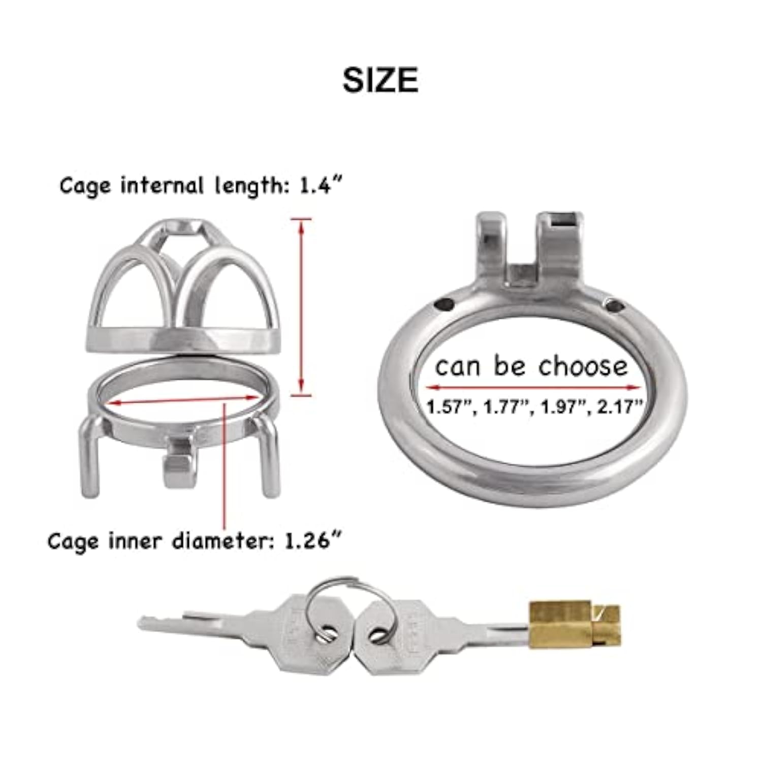 | Material: High Quality Real 304 Metal Stainless Steel, Pure Hand Mirror Polishing, Smooth Without Burr And 100% Hypoallergenic. | | Features: Comfortable, Sturdy, Not Easy To Fall Off, Bringing All-Round Care. | | 4 Base Rings With Different Inner Diameters: (1.57'', 1.77'', 1.97'', 2.17'') . You Can Choose One Of Them 1. | | Package Includes: 1 X Base Ring?1 X Cage?1 X Lock With 2 Keys. | | Protect Privacy: Opaque Package, Product Information Won'T Be Shown In The Package Or Customs Declaration. | |