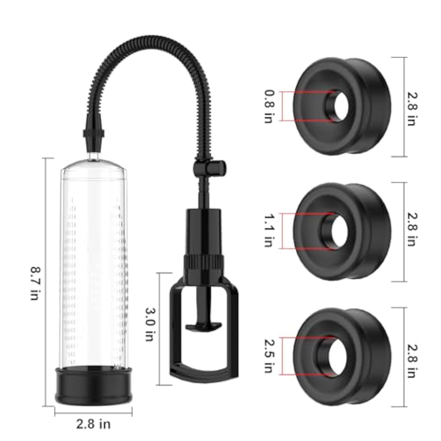 | Tailored Penis Enlargement With Adjustable Vacuum Pressure: The Manual Penis Pump Is Designed For Men Looking To Enhance Size And Improve Functionality Naturally. Its Adjustable Vacuum Pressure System Allows You To Control The Intensity, Making It For Beginners And Advanced Users Alike. This Feature Enables Users To Gradually Increase Pressure, Ensuring A Comfortable And Effective Training Process | | Three Versatile Sleeves For A Customized Experience: This Product Comes With Three Interchangeable Sleeves Of Varying Sizes, Catering To Different Needs And Preferences. The Soft And Snug Sleeves Create A Firm Seal, Optimizing The Vacuum Effect While Ensuring Comfort During Use. Whether You’Re Starting Your Journey Or Already Experienced, The Sleeves Offer Unmatched Versatility For Every User | | Crystal-Clear Cylinder With Precision Measurement: The Transparent Cylinder Includes A Detailed Scale, Providing A Visual Representation Of Your Progress During Each Session. The Easy-To-Read Markings Encourage Consistent Usage By Allowing Users To Track Improvements Over Time, Creating Motivation And Confidence With Every Step Forward | | Effortless Cleaning And Maintenance: Keeping The Pump Hygienic Is Simple With Its Modular Design. The Detachable Silicone Ring, Removable Tubing, And Washable Cylinder Make It Easy To Clean Thoroughly. A Step-By-Step Guide Is Included, Ensuring You Can Maintain Your Pump Quickly And Efficiently, Keeping It Ready For Use At All Times | | Promotes Stronger And Longer-Lasting Erections: By Increasing Blood Flow To The Penis, This Vacuum Pump Not Only Supports Penis Enlargement Goals But Also Helps Achieve Stronger, Firmer, And Longer-Lasting Erections. Whether Used As A Training Tool Or During Intimate Moments, It Offers Enhanced Confidence And Satisfaction | | Ergonomic Design With Instant Air Release Valve: Featuring A Hand-Operated Pump Handle Designed For A Secure Grip, This Device Ensures Effortless Control Throughout Use. The Integrated Air Release Valve Provides Immediate Pressure Adjustment, Allowing Users To Fine-Tune The Vacuum Levels Or Release Pressure Instantly For Maximum Safety And Comfort | | Portable And Travel-Friendly Companion: With Its Compact And Lightweight Design, The Manual Penis Pump Is An Excellent Choice For Users Who Travel Frequently. Its Discreet Size Makes It Easy To Pack And Carry, Offering Convenience And Privacy Wherever You Go | |