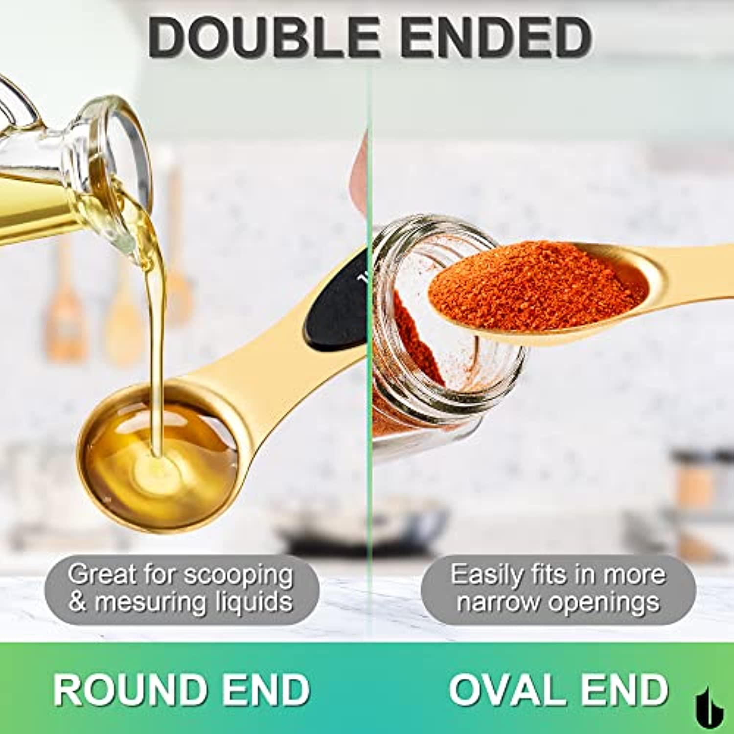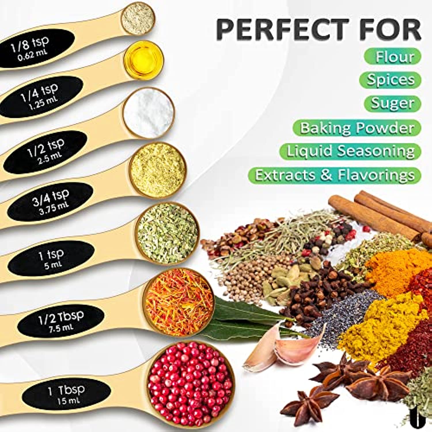 - Dual-Sided for Multi-Purpose Use - each magnetic measuring spoon has a slim end to better fit most spice jars; the opposite end is round and is perfect for liquids; can use for both purposes without having to wash between solids or liquids