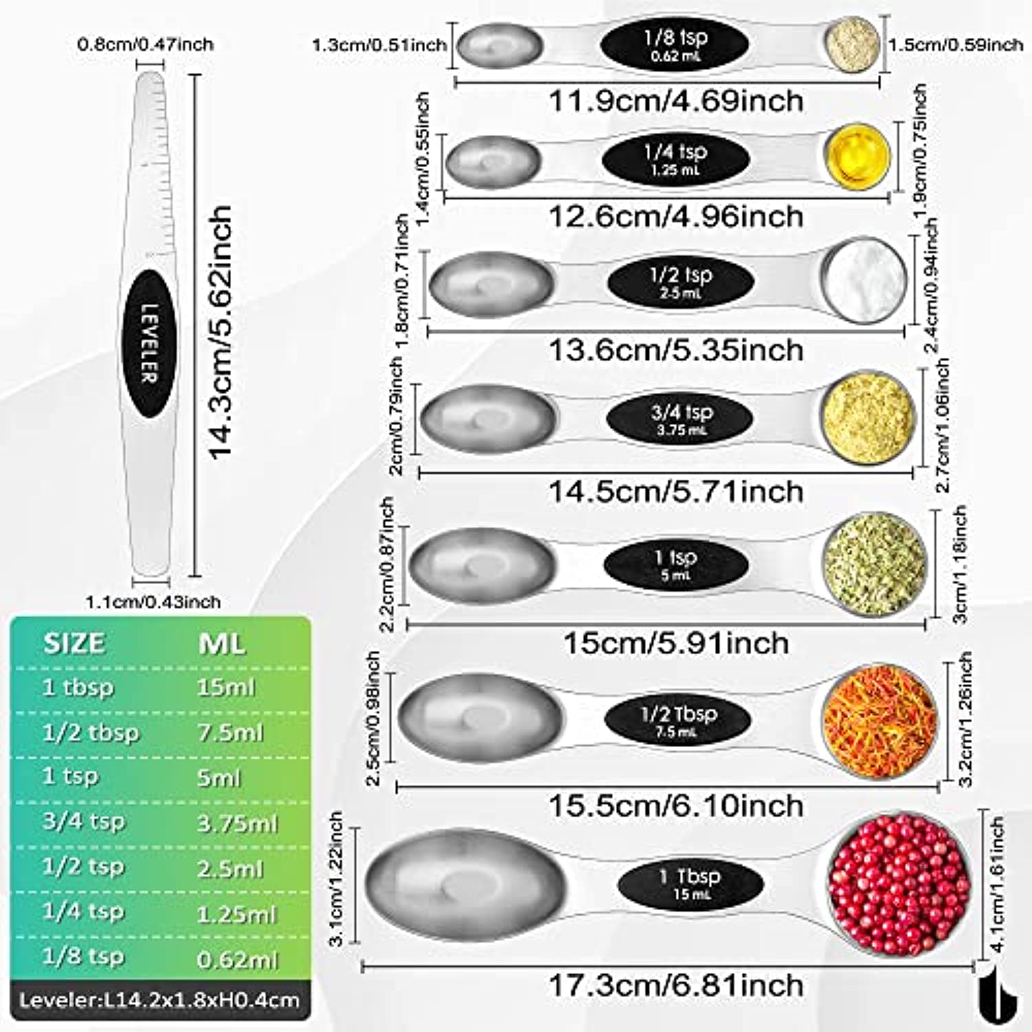 - 7 spoons in Convenient Sizes: 1/8 tsp, 1/4 tsp, 1/2 tsp, 3/4 tsp, 1 tsp, 1/2 Tbsp, 1 Tbsp plus Leveler