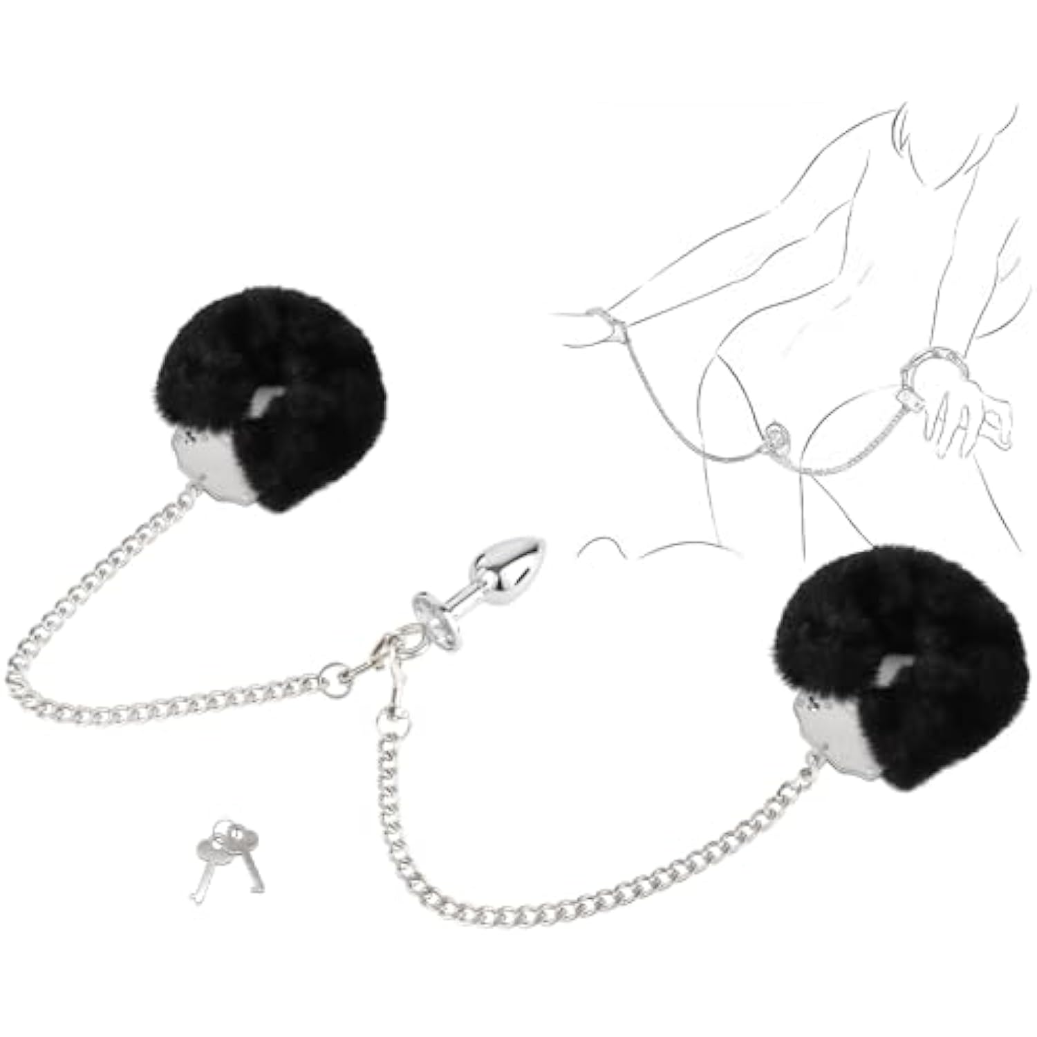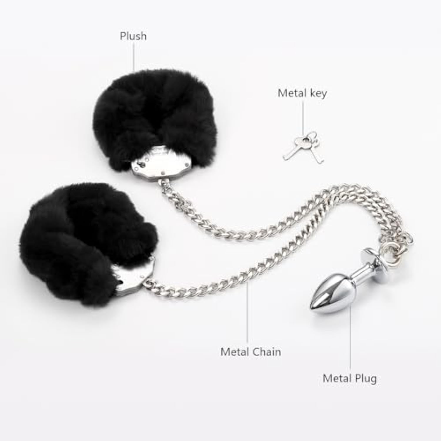Metal Butt Plug With Furry Handcuffs Stainless Steel Wrist Restraints & Anal Plug Adult Sexual Toys For Women (Black)