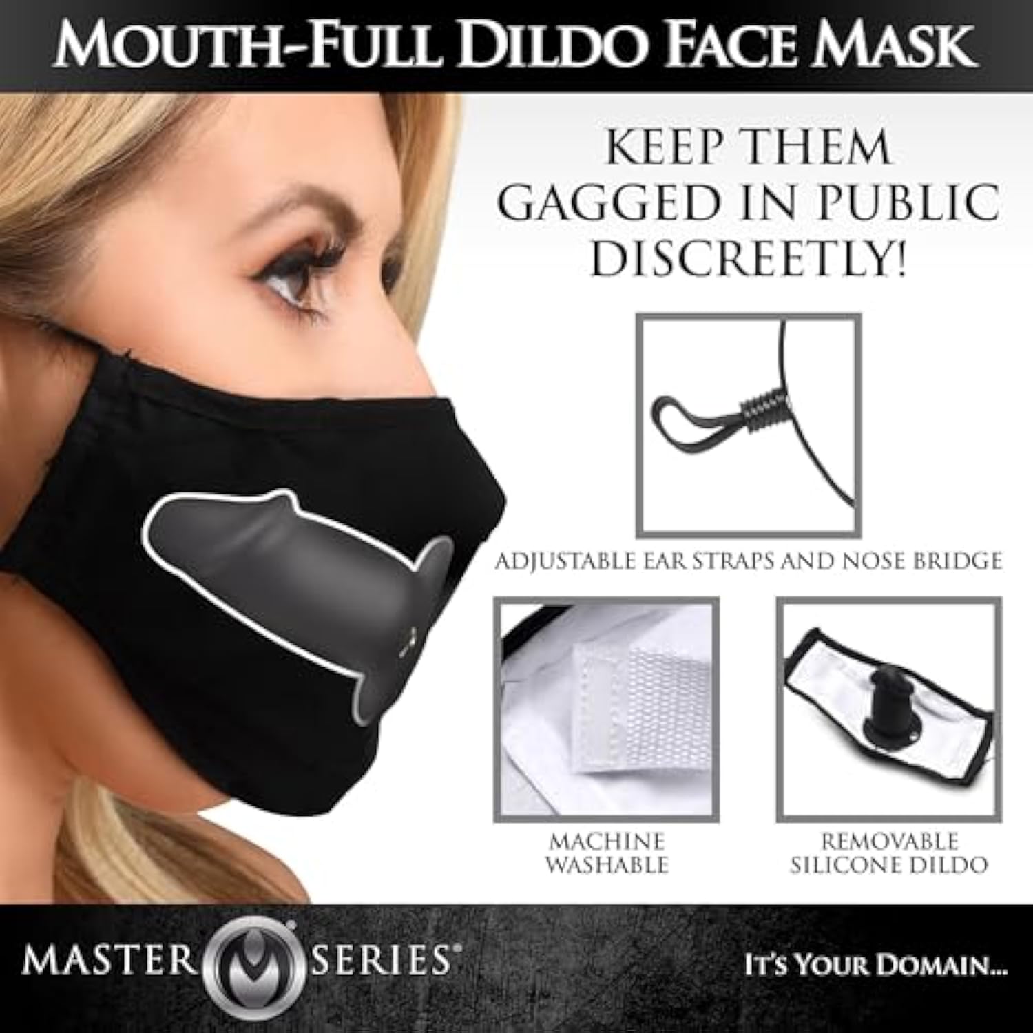 Mouth-Full Premium Silicone Dildo Face Mask For Men Women & Bdsm Couples. Breathable Cotton Face Mask With Hidden Silicone 2.8 Inch Dildo Gag. Machine Washable - Black