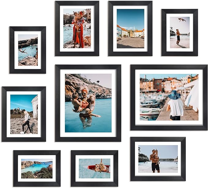 - Different Sizes Frames: The assorted picture frames include 10 frames with white mats, 2 pcs 8x10 frames, 4 pcs 4x6 frames, 4 pcs 5x7 frames. They are nice family picture frames collage wall decor. Our fames are matted to prints inside the frame, so these outer frames are larger than many others for a better visual effect!