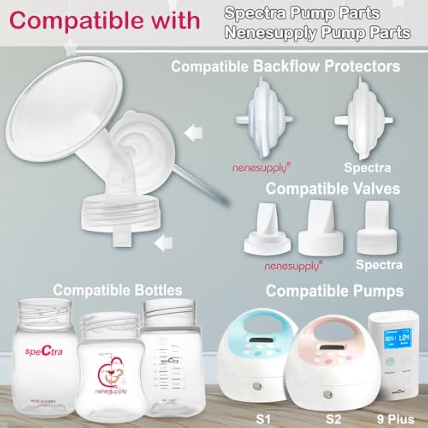 | CONTENTS: 4 24mm Flanges, 4 Duckbill Valves, 4 Backflow Protectors, 4 Bottles and 4 Tubing. All the parts are compatible and interchangeable with Spectra parts, and bottles. NENESUPPLY COMPATIBLE PUMP PARTS 24mm FLANGE FOR SPECTRA S1 S2 9 PLUS BREASTPUMPS. Made by Nenesupply. Inc | | ALL PARTS MADE BY NENESUPPLY. ALL PARTS ARE COMPATIBLE and INTERCHANGEABLE WITH ORIGINAL PARTS that come with your Spectra pumps.Not Original Spectra S2 Accessories. Not original Spectra Pump Parts and S1 parts. | | SAME SUCTION AS ORIGINAL PARTS. Valves, backflow protectors, and flanges form an air-tight seal. The parts can replace Spectra Flanges, Duckbill Valves, Backflow Protectors, Tubings, and Bottles (Wide Mouth). Multiple flange sizes available: 15mm, 17mm, 19mm, 21mm, 24mm, 27mm, 30mm. | | Backflow protectors fit securely with tubing. The membrane is elastic and flexible and can maintain suction through multiple pumping cycles. It is a closed system and protects your pump. Tubing is longer than original tubing and it is easy to use while pumping. | | LEAK-PROOF BOTTLES - The bottles come with leak-proof caps and sealing rings. The bottles works with collars and nipples of Nenesupply, Avent and Spectra. The using temperature of the bottles ranges from -20 ~100 degree Celsius. They can be stored in the fridge, and can use bottle warmer to warm up the milk. They can be used as storage bottles and are easy for travel. | | All parts are BPA free, and Comply with FDA regulations for food