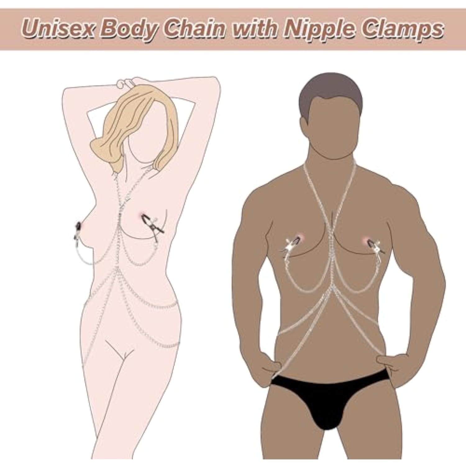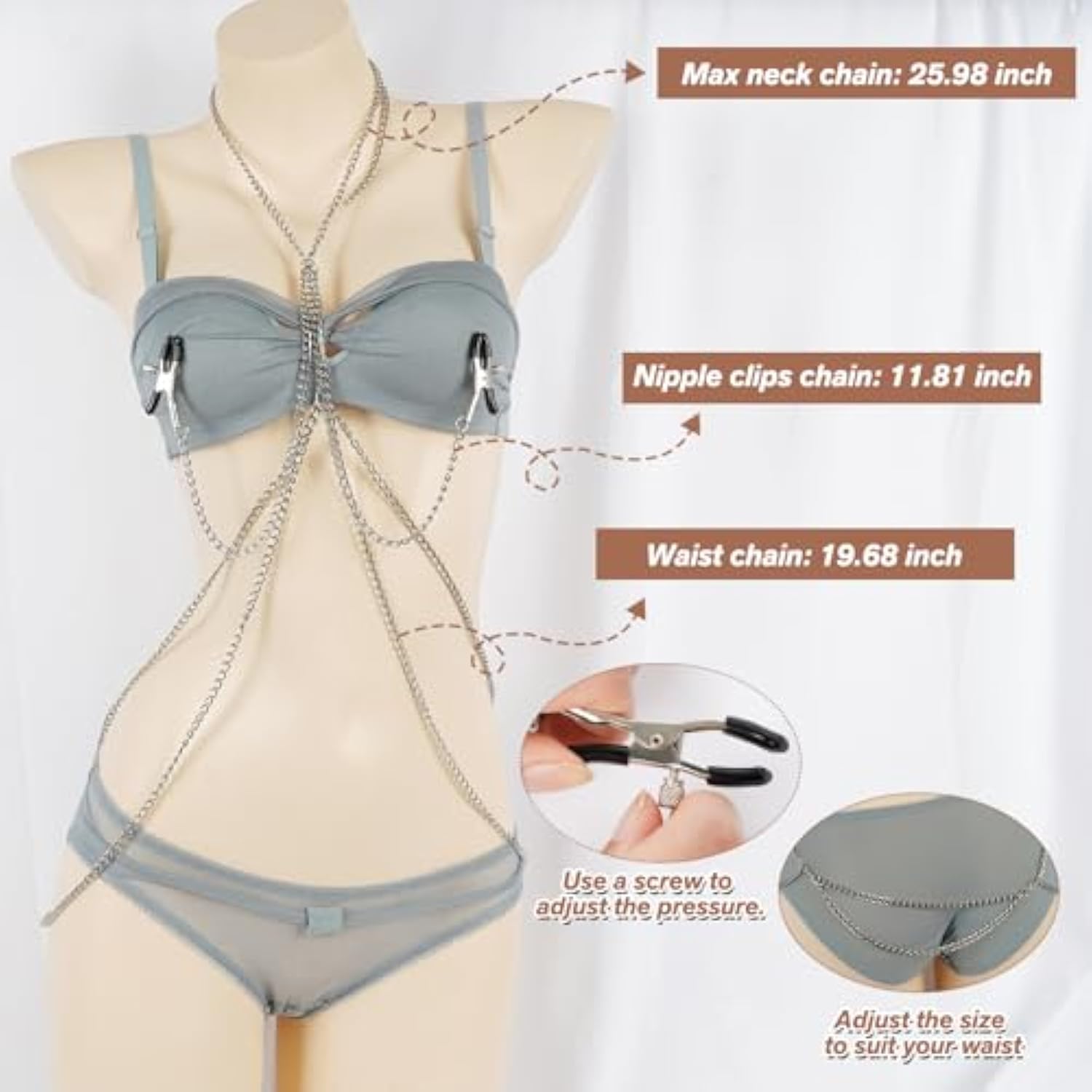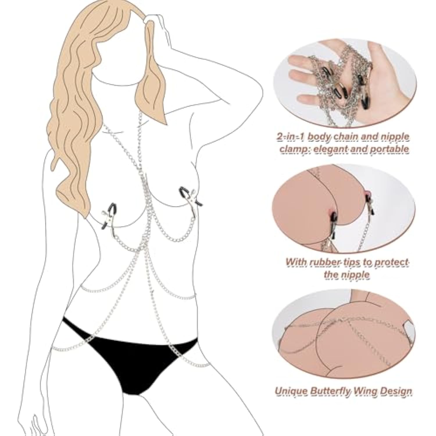 Nipple Clamps Body Jewelry Bdsm Sex Toy, Adjustable Non-Piercing Nipple Toys Body Chain With Necklace Bondage For Games, Kinky Breast Clips For Women Couples Pleasure (Silver)