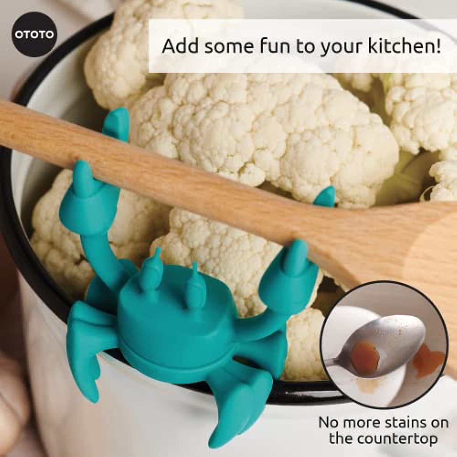- Meet Aqua the Crab - We bring you Aqua the Crab ready to lend a helping claw! This non-slip silicone utensil rest and spoon holder takes off the hassle while you do the hustle.