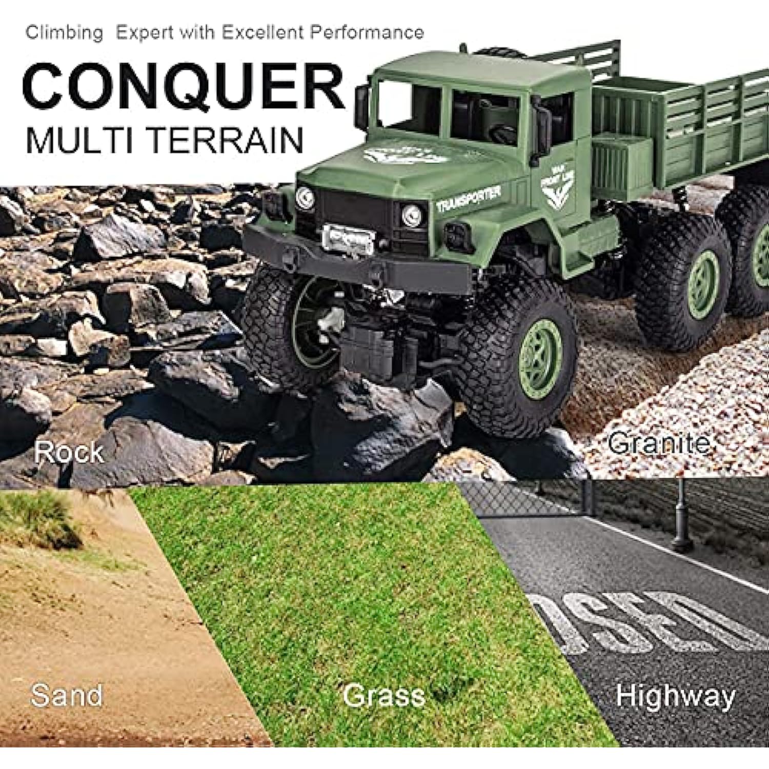 - SUITABLE FOR KIDS: 1/18 All Terrain RC military trucks with 500g load capacity, has a strong ability to climb on the lawn, on the beach and on the rocks and other complex terrains. The speed of 10-15km/h is suitable for children. Even 3 age+ kids can drive the truck easily.