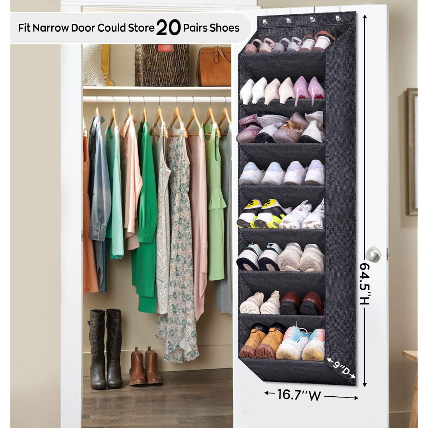 - 【8 Shelves with Large Capacity】: This narrow over the door shoe rack for closet is great for small space, like closet, dorm, wardrobe and pantry room, laundry room. Its dimension is 64.5"L x 16.7"W x 9"D yet it’s able to hold up to 20-22 pairs of shoes;
