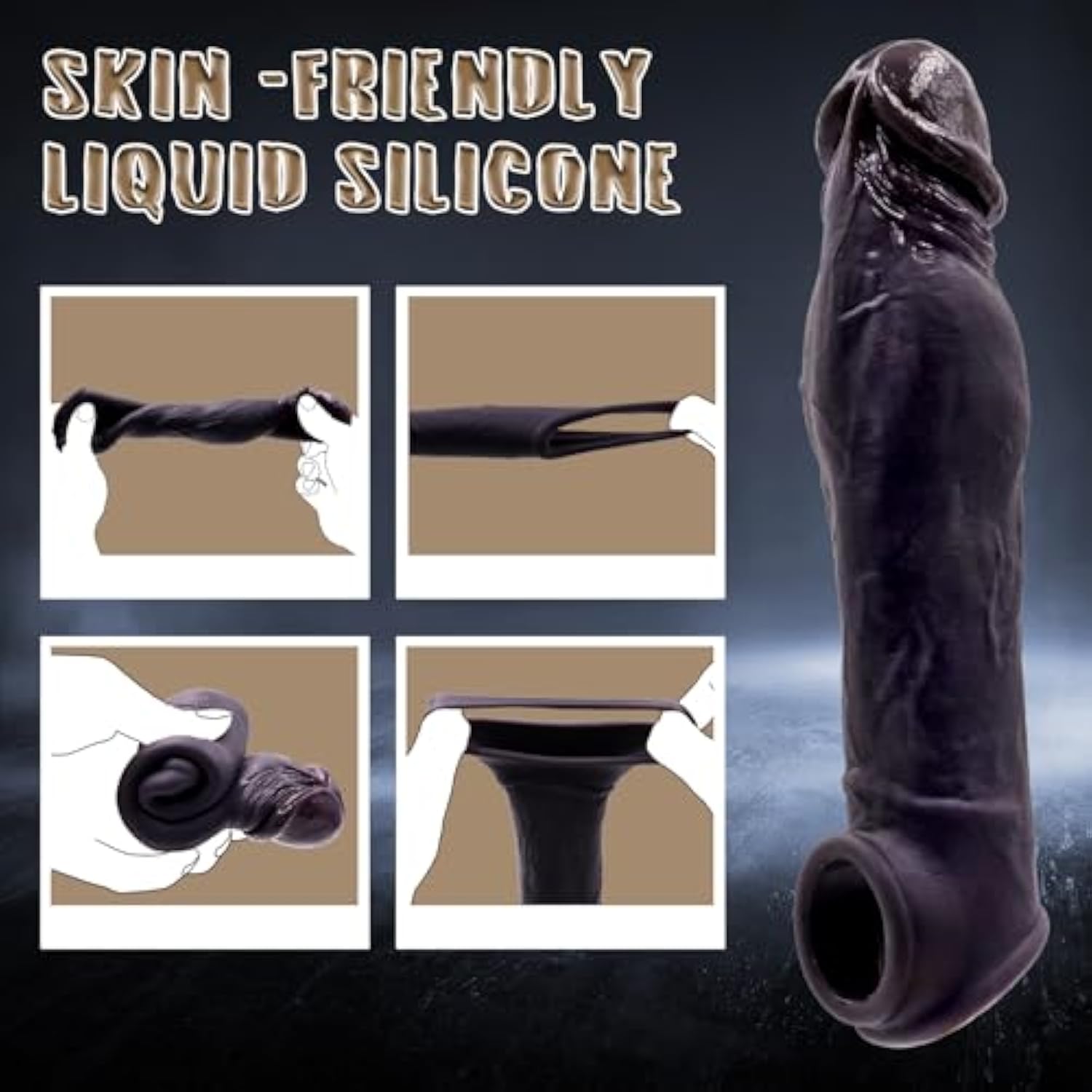 Penis Sleeve With Cock Ring Sex Toys, Ultra-Soft Silicone 8.6'' Cock Sleeve, Reusable Penis Cuff Thickened Testicle Ring Male Adult Toys, Penis Extender And Penis Enlarger For Men(Brown)