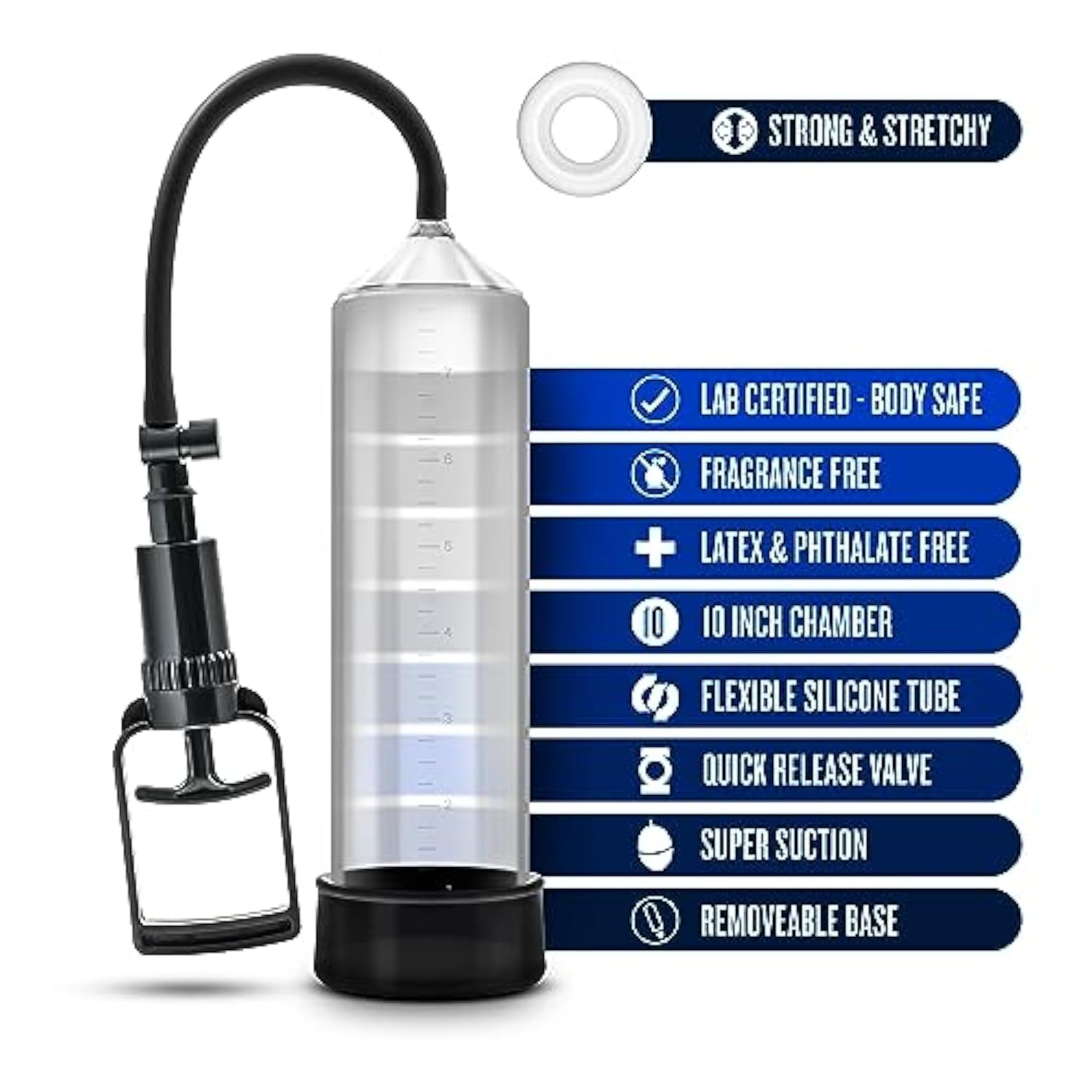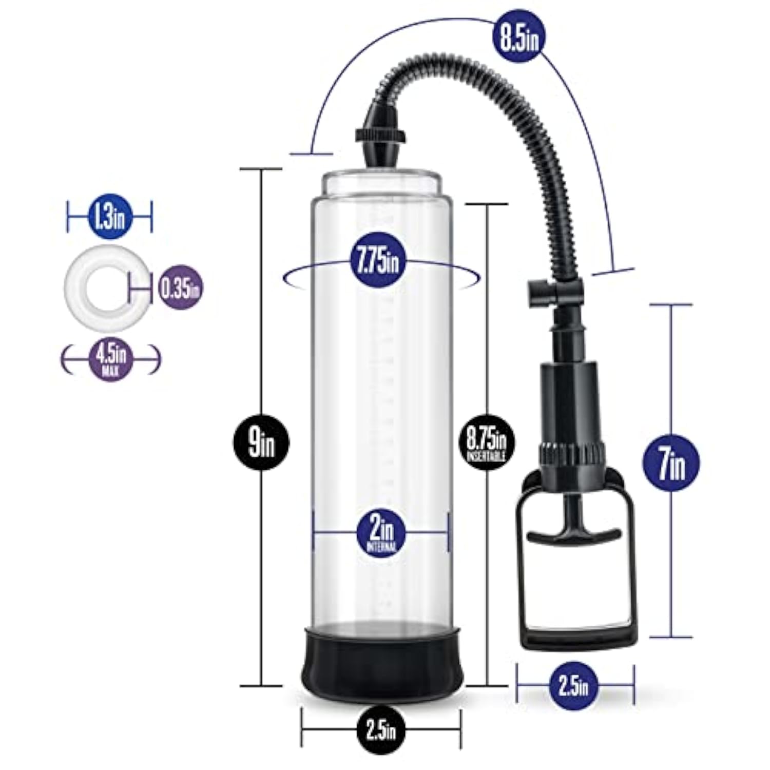 | Quality - Precision Design. Tight Seal. High Performance. Ultimate Pleasure | | The Specs - 9" Overall Length. Cylinder Is High Impact Polycarbonate. Measures 8.75"L X 2.5"W. Etched Measurement Markings To Measure Growth | | Performance - Advanced Pull Handle Design Generates More Vacuum Than Bulb Pumps For Bigger Results | | Includes - 1 Ultra Soft Pump Sleeve For Maximum Pleasure. 1 Stay Hard Cock Ring. Detailed User Safety Manual | | Peace Of Mind - Responsibly Made By Blush. U.S. Maker Of Quality Sexual Health Products Since 2007. Includes A Detailed Product Instruction And User Safety Manual. Easy Safety Pressure Release Valve | |