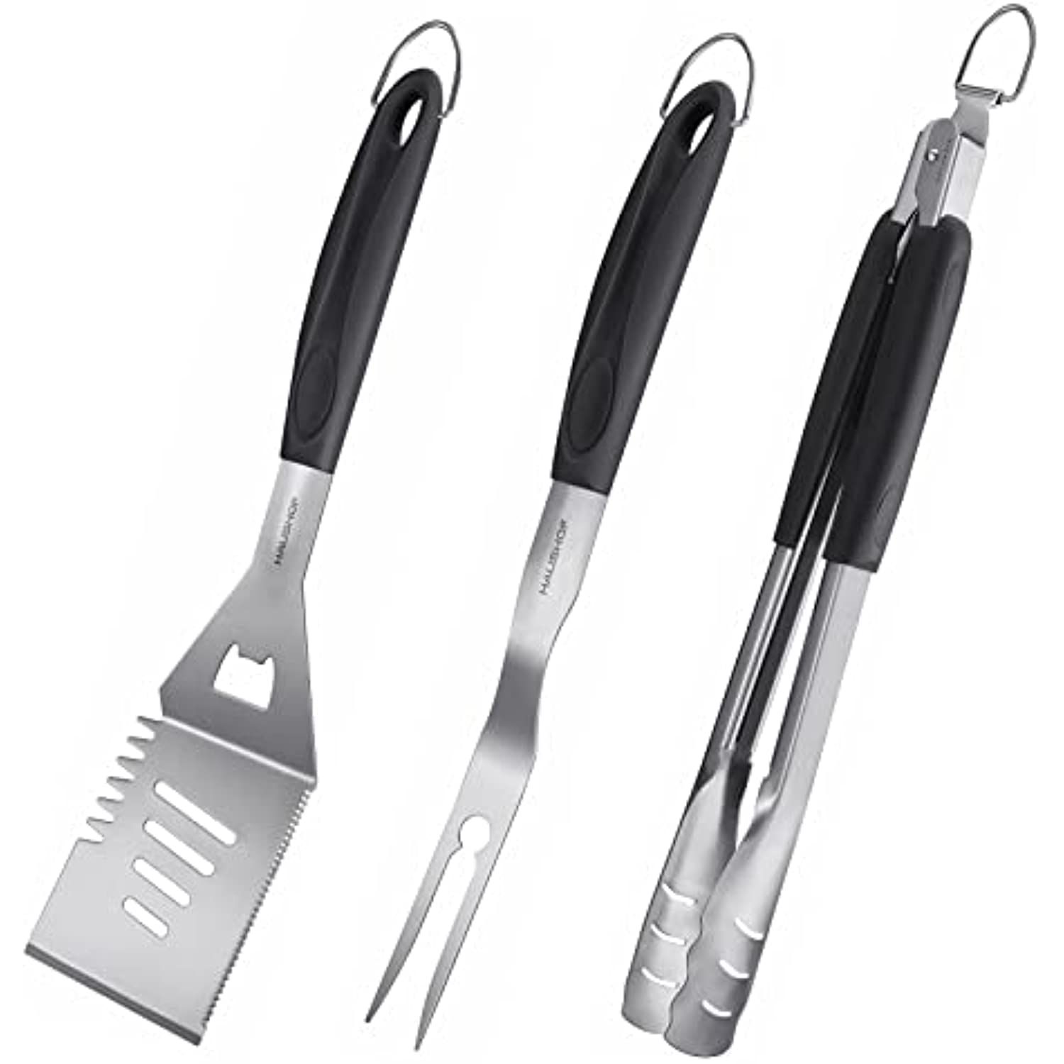 - 4-IN-1 Spatula : Drain Excess Grease; Cut meat; Air Hole Creator; bottle opener. The large Spatula in these BBQ accessories can satisfy various needs.