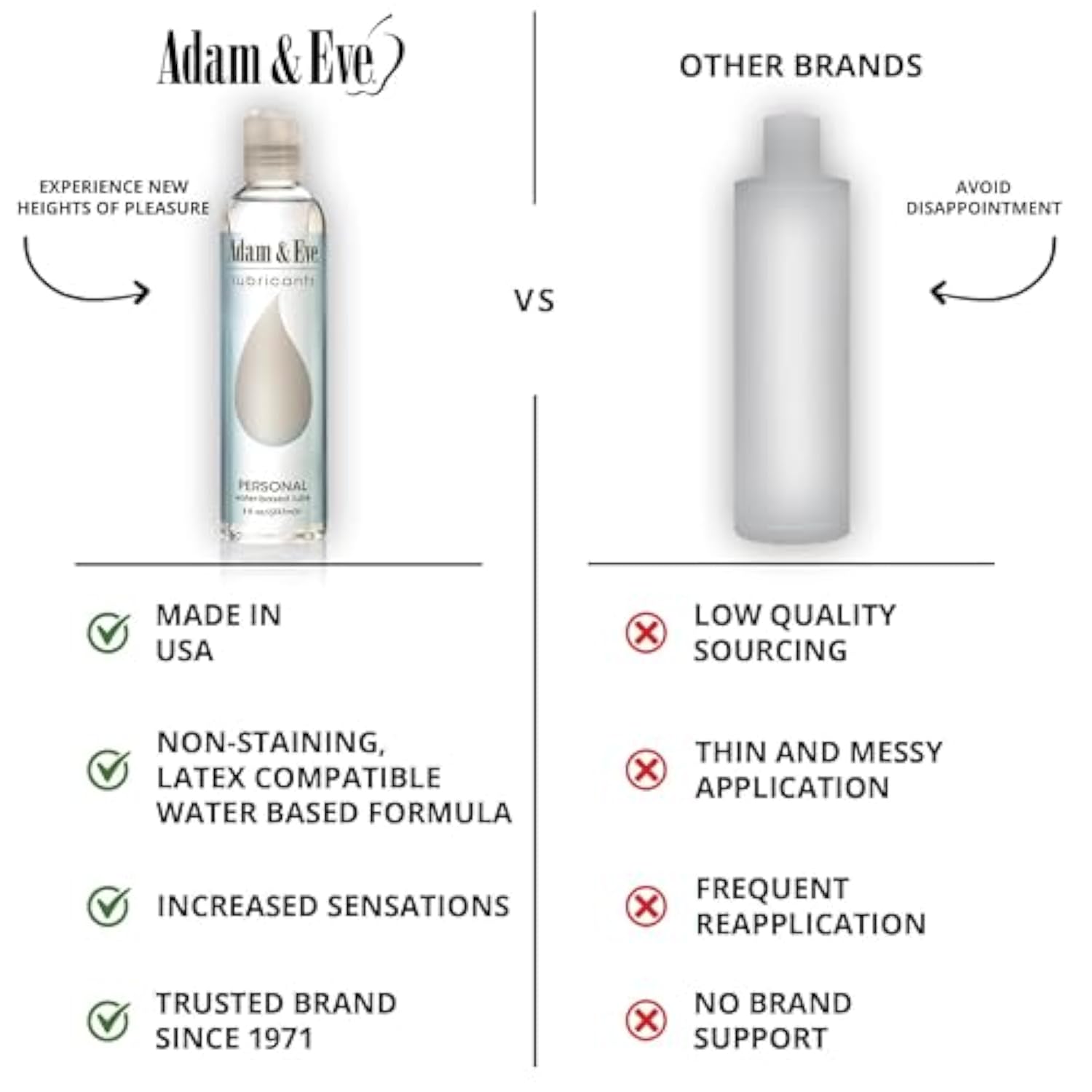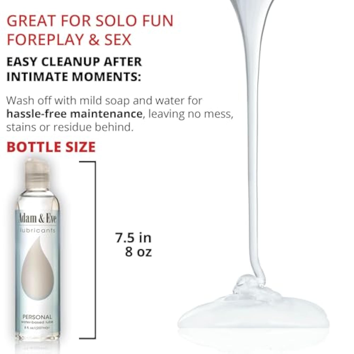 | Ultra-Slippery For Intense Pleasure: Enjoy A Smooth, Slick Experience With Adam Eve Personal Lubricant. This Water-Based Lube Provides Long-Lasting Slickness To Enhance Your Pleasure, Whether You’Re Engaging In Solo Play, Foreplay, Or Sex. Perfect For Use With All Sex Toys And Condoms. | | Safe For Sensitive Skin: Adam Eve Personal Lubricant Is Gentle On Your Skin, Providing A Protective Layer That Helps Prevent Chafing Or Irritation. Its Mild Formula Keeps You Comfortable During All Your Intimate Moments, Ensuring A Pleasurable And Safe Experience For Both Men And Women. | | Easy To Clean, Easy To Use: With A Few Drops, You’Re Ready For More Satisfying Fun! When You’Re Done, Cleanup Is Quick And Easy With Warm, Soapy Water. This Lubricant Is Non-Sticky And Won’T Leave Any Residue Behind, Making Post-Play Care Simple And Hassle-Free. | | Versatile And Long-Lasting: Whether You'Re Using It For Masturbation, Foreplay, Or Partnered Sex, Adam Eve Personal Lubricant Ensures All Your Intimate Activities Are Smooth And Pleasurable. It’S Compatible With Condoms, Vibrators, Masturbators, And More, Providing An Ultimate Glide For All Your Needs. | | Trusted Usa Brand Since 1971, Adam Eve Is Committed To Providing High-Quality Lubricants And Superior