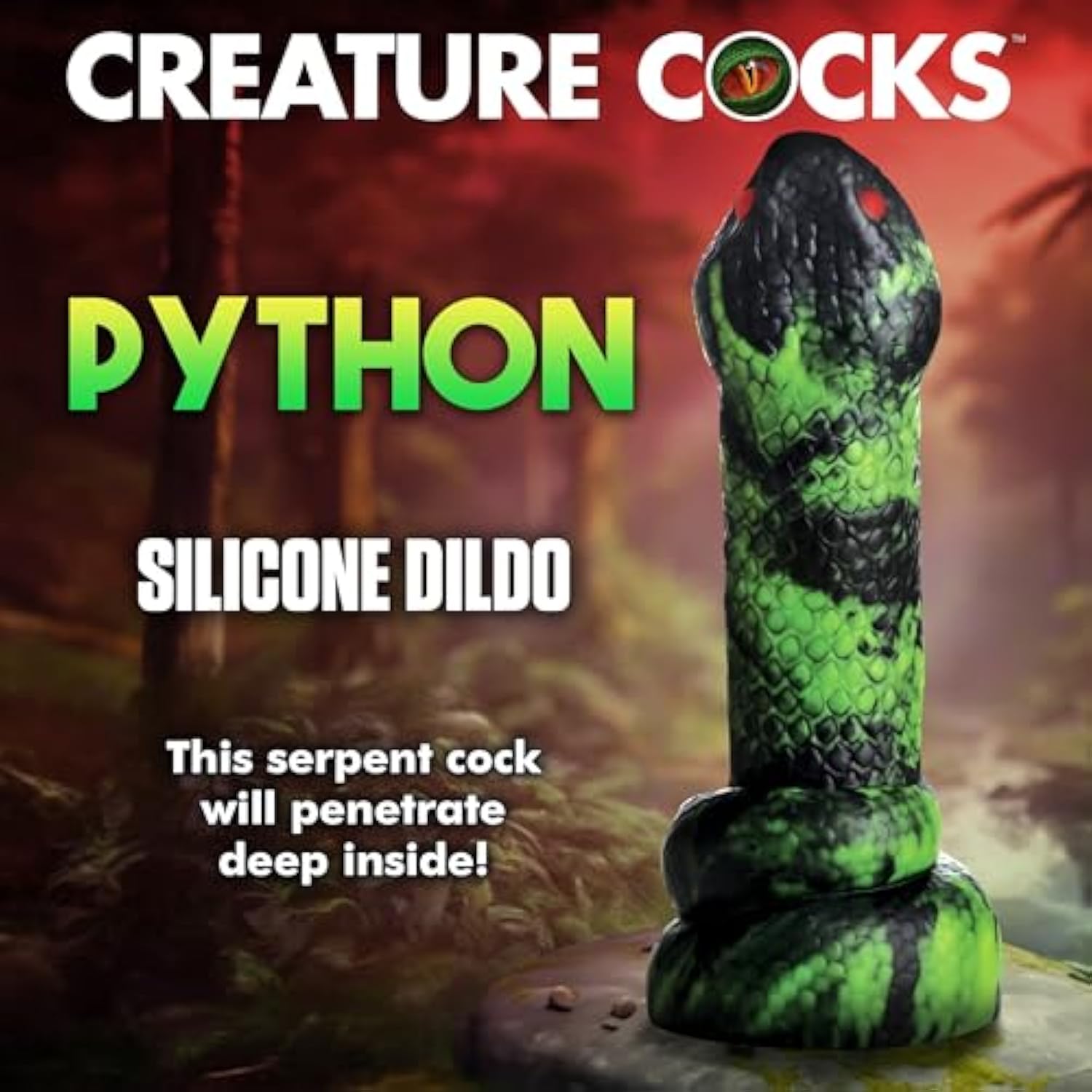 Python Silicone Dildo For Beginners, Men, Women, & Couples. Fantasy Dildo With Suction Cup Base. Harness Compatible, Premium Silicone. 1 Piece, Green & Black.