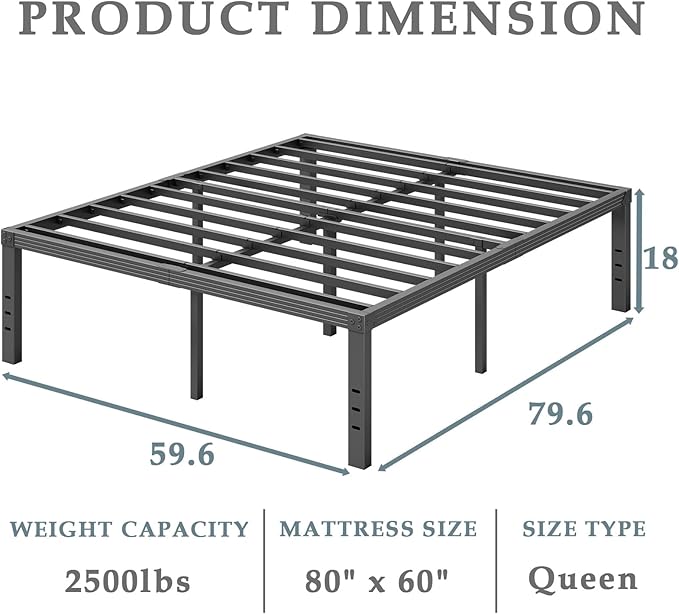 - HEAVY DUTY QUEEN BED FRAME: Reinforced steel support slats, 2500 LB of weight capacity to give the mattress stable support, help extend the life of the mattress, queen bed frame no box spring needed