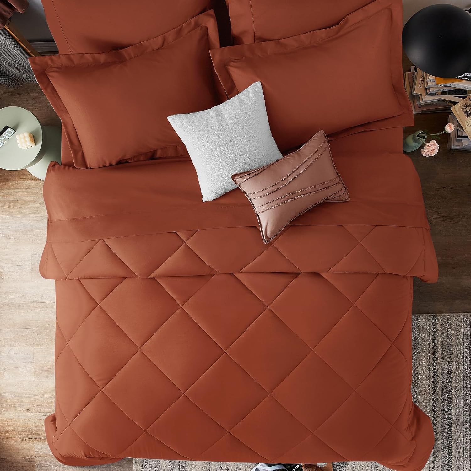 Queen Comforter Set With Sheets 7 Pieces Bed In A Bag Burnt Orange All Season Bedding Sets With Comforter, Pillow Shams, Flat Sheet, Fitted Sheet And Pillowcases