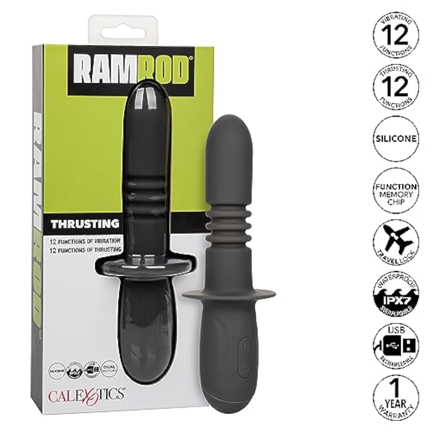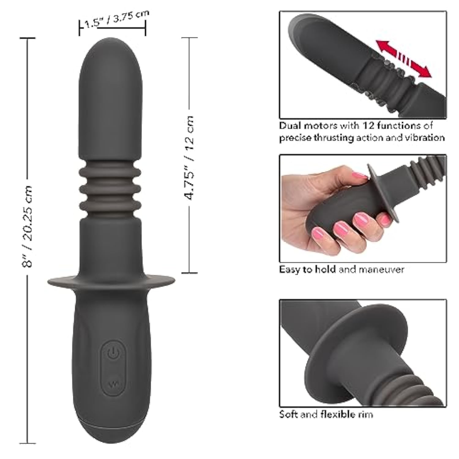 | Powerful Dual Motor Probe With Precise Thrusting Action Plus Vibration With Smooth Silicone And Waterproof | | 12 Intense Functions Of Vibration, Pulsation And Escalation | | 12 Functions Of Powerful Up And Down Motion | | Security Travel Lock Feature – Hold For 3 Seconds To Turn On Or Off | | Usb Rechargeable – Charging Cord Included; Complete Charge In 2 Hours; Runs For 60 Minutes On High Speed And 100 Minutes On Low Speed; 1-Year Limited Manufacturer | |
