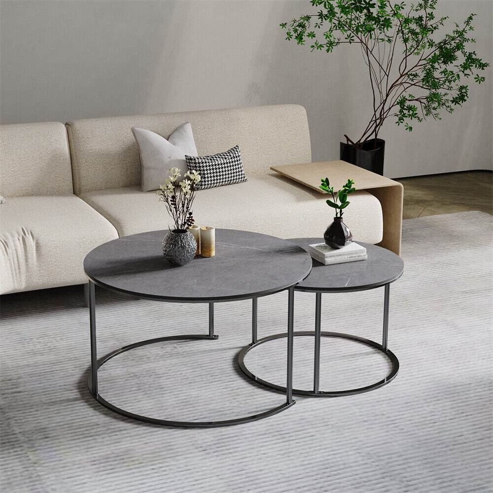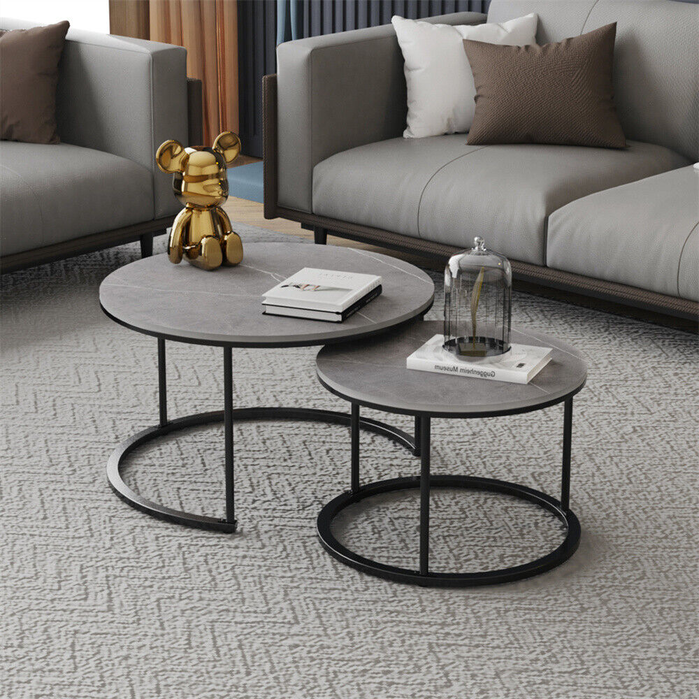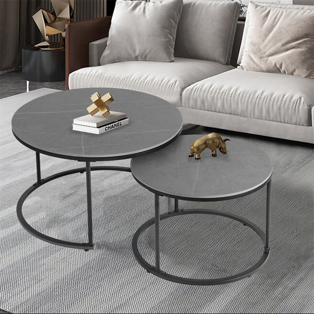 Real Marble Round Coffee Table Set Of 2 Nesting Side End Table Sturdy Metal Leg