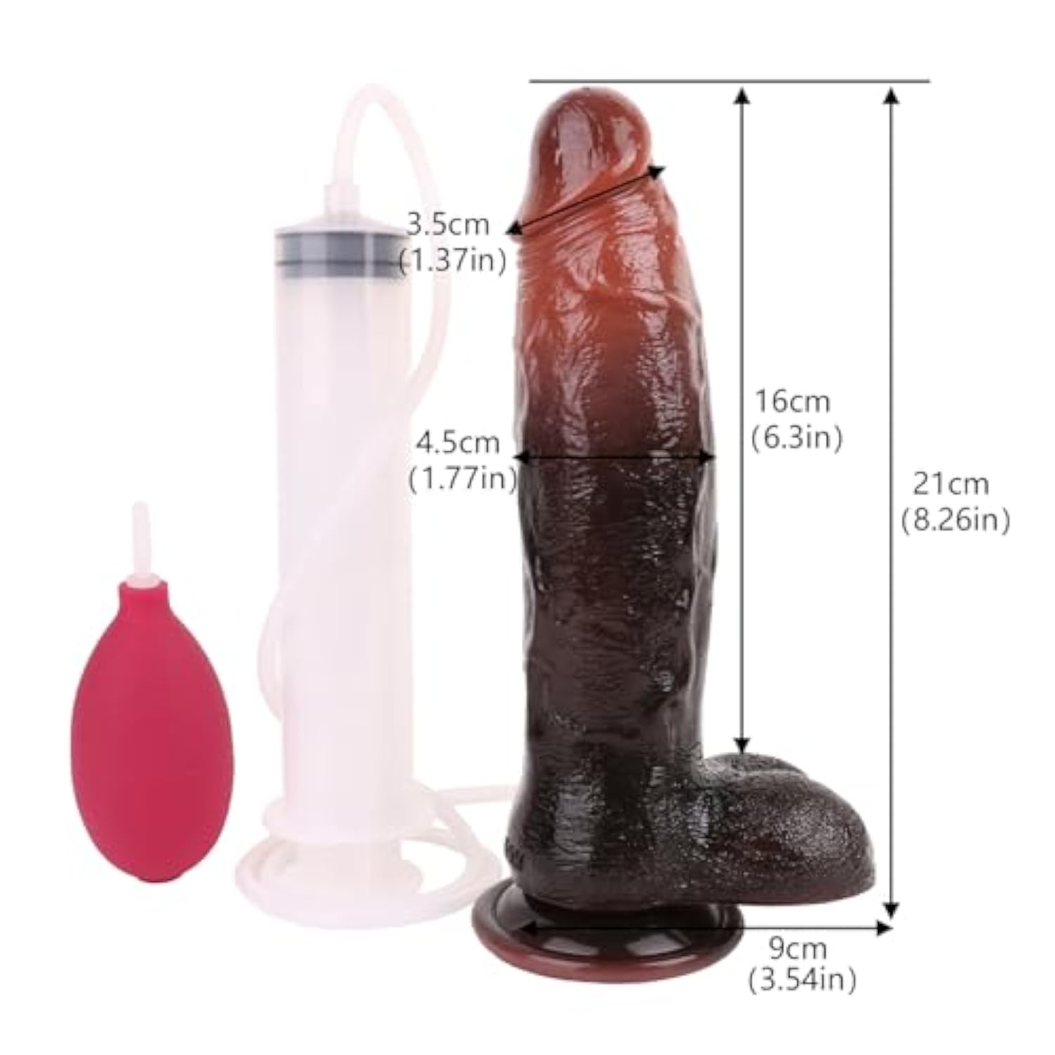 | Squirting Dildo: Equipped With Squeezable Bulb, This Anal Dildo Provides Powerful Ejaculating Action, Suitable For Anal Play, The Anal Douche Enema Bulb Is Detachable And Easy To Clean | | Satisfying Size: Total Length: 8.26 Inches, Insertable Length: 6.3 Inches, Diameter: 1.37 Inches | | Suction Cup Dildo: The Strong Suction Cup Allows The Big Dildo Secure To Flat And Smooth Surfaces, Enable For Hands-Free And Pegging Play | | Realistic Dildo: Featuring A Lifelike Head, Veined Shaft, And Textured Balls | | Package: 1*Dildos+Injection Bag+Aeration In Discreet Package Adult Sex Toy For Women | |