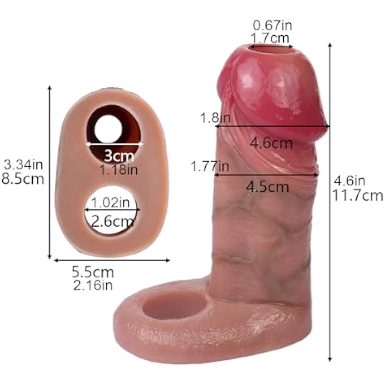 - Penis Sleeve Extender Full Length 11.7Cm(4.6In), Width 4.5-4.6Cm(1.77-1.8In), Penis Ring Inner Diameter 3Cm(1.18In), Cock Sleeve Inner Diameter 2.6Cm(1.02In).