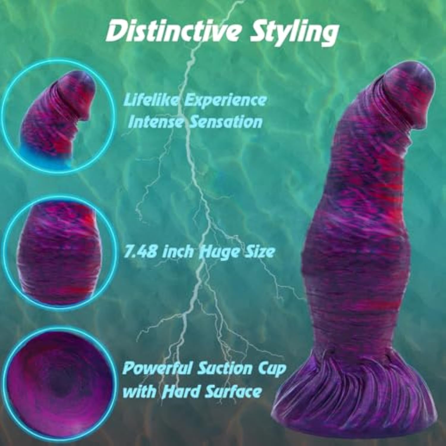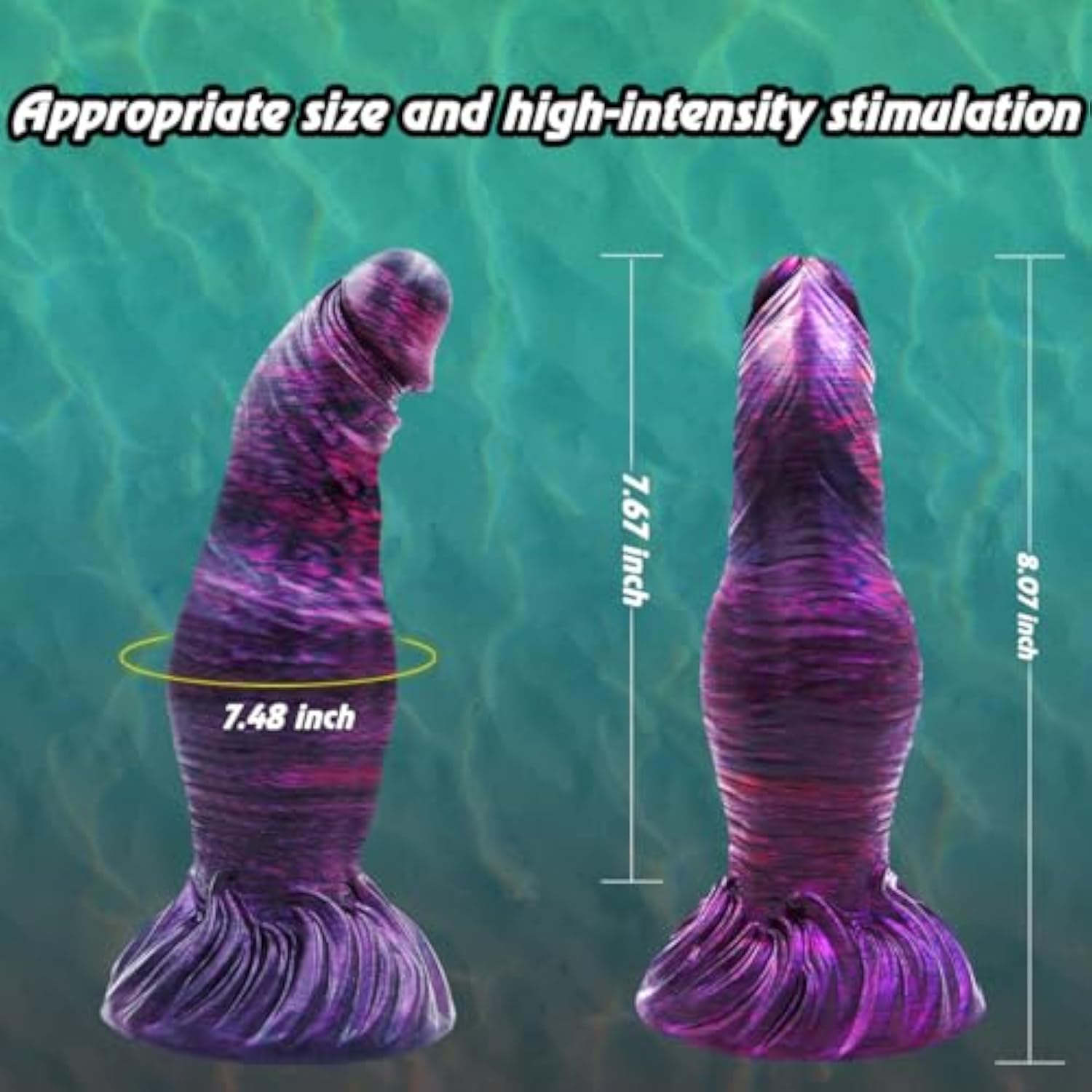 - Unique Realistic Monster Dildo - This Fantasy Dildo Sex Toy Is Made From A Mix Of Black And Purple Colored Silicone, Total Length Is 8.07" And Insertable Length Is 7.67". In Shape, It Is Designed With A Simulated Insertion Tip, A Large Knot With 7.48" C