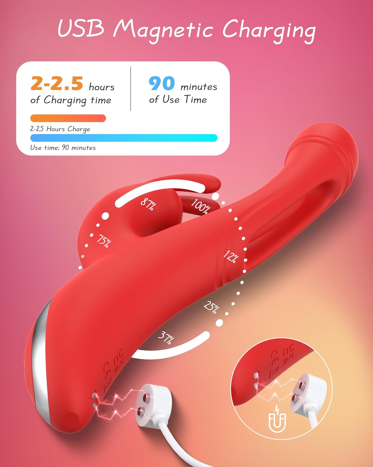 Rechargeable via a magnetic USB cable, this vibrator offers up to 55 minutes of use after a full 2-hour charge, ensuring uninterrupted pleasure.