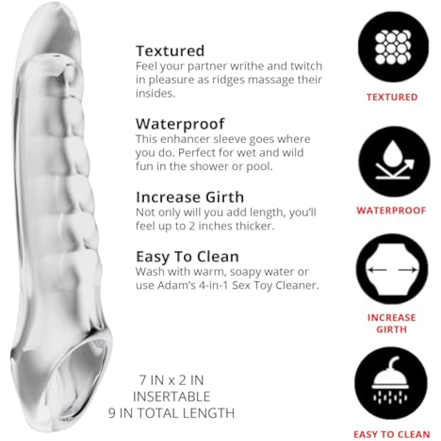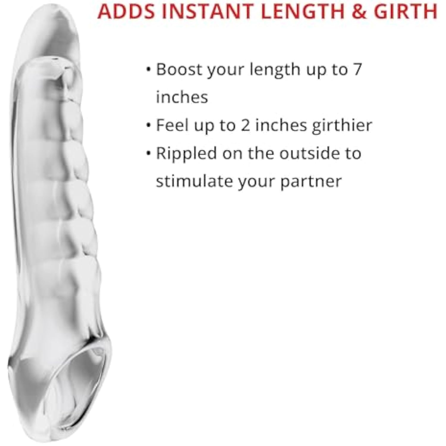 - Boost Size For Maximum Pleasure: Instantly Enhance Your Shaft With This Ultra-Stretchy Sleeve, Adding Up To 7 Inches In Length And 2 Inches In Girth. Designed For A Natural Feel, This Clear Penis Enhancer Delivers A Fuller, More Satisfying Experience, M