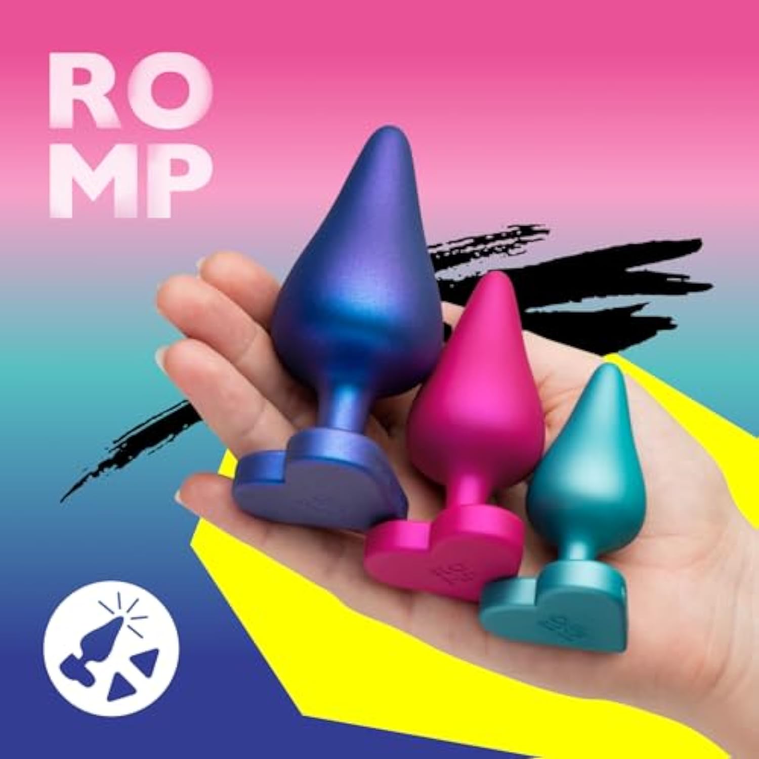| THREE TIMES THE FUN: ROMP Luster is a trio of butt plugs designed to as an intro to anal play. Start small and work your way up through the three sizes. | | THE PERFECT FIT: Tapered tips, slim necks and flared bases keep ROMP Luster anal plugs comfortable to wear, no matter how long you play. Their ergonomic shape also makes them delightfully easy to insert and remove. | | SMOOTH, SILKY, SAFE: Ultra-hygienic, hypoallergenic and sensually soft, this durable, skin-friendly material feels great on your body and warms in