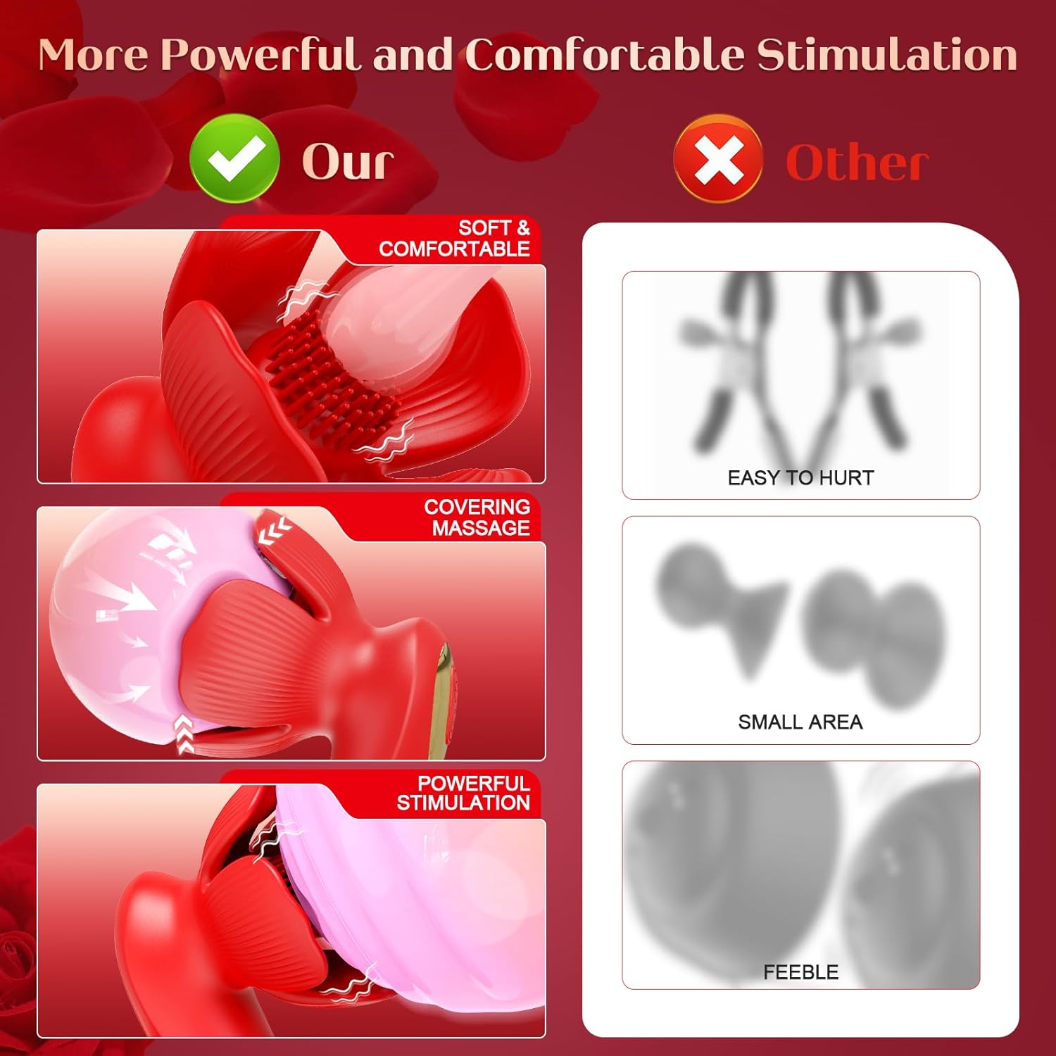 - 【Petal shaped design】:Different from other nipple toys, this sex toys nipple vibrator appears like a blooming blood red rose. In ancient Greek mythology, blood red rose symbolize all gods of love, loyalty, beauty, and pleasure. After pressing the button of this rose sex toy, the petals open and close, and the middle stamens vibrate and sway, just like an elegant dancer. Our adult sex toys can not only massage the breast in all directions but also provide a unique aesthetic visual feeling.