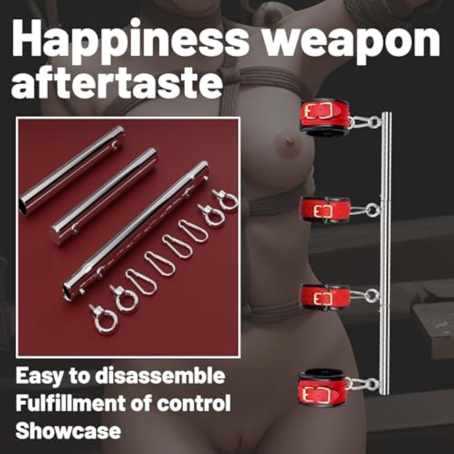 | Versatile Sm Restraint Set: This Sm Bondage Set Includes 2 Handcuffs, 2 Ankle Cuffs, 4 D-Ring Buckles, 4 Screws, And 3 Stainless Steel Rods. | | Secure And Comfortable Restraint Experience: Made Of Stainless Steel, Alloy And High Quality Leather, Safe And Durable. The Restraint Bondage Sex Toy Are Made From Imported High-Density Soft Leather With A Sponge Padded Interior Which Is Sturdy Enough To Avoid Tear. The Handcuffs, Ankle Cuffs, And Neck Collar Provide A Secure Hold While Ensuring Comfort During Various Bondage Positions. | | Adjustable And Detachable: The Versatile Detachable Spreader Bar And Buttons Are Made Of High Quality Stainless Steel Metal, Climbing Latch Design, Which Is Finely Crafted And Sturdy, So You Don'T Have To Worry About Damage. | | Explore The World Of Bdsm: Whether You'Re New To Bondage Or A Seasoned Practitioner, Our Bondage Spreader Bar Provides Endless For Exploration And Pleasure. Experience The Power Of Control As Your Partner Delve Into The World Of Bdsm | | After-Sales And Hidden Packaging: The Product Is Packaged In Privacy, Our Discreet Packaging Is Worry-Free.Please Feel Free To