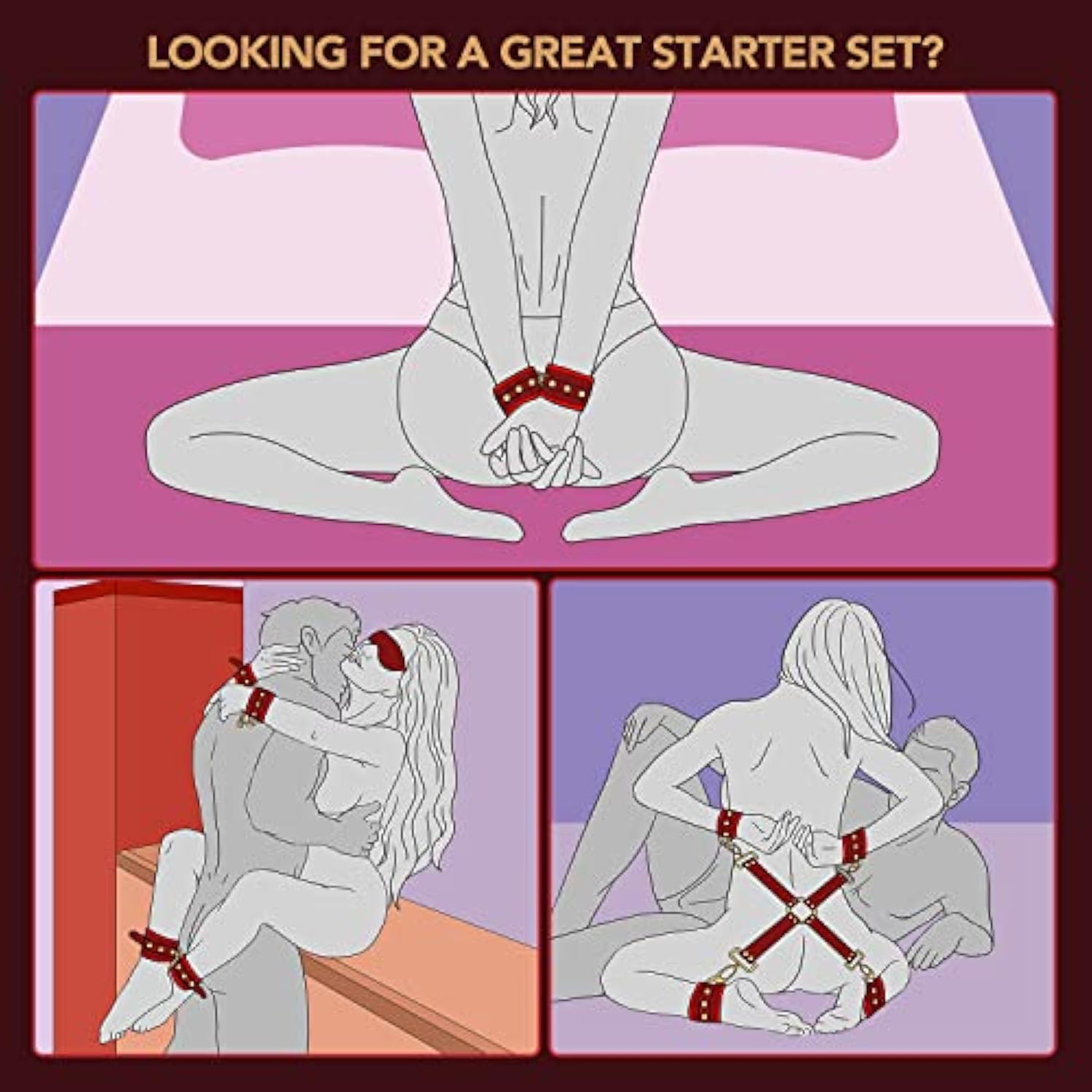 - More Ways To Foreplay 11 Pcs - This Sex Bondage Kit Consists Of 11 Accessories In Total (1X Restraint Belt, 2X Paddles, 2X Ankle Cuffs,2X Handcuffs 1X Blindfold, 1X Feather Tickler,1Xtraction Rope Send A Storage Bag,Light Soft Sexy Eyepatch, Purple Whip