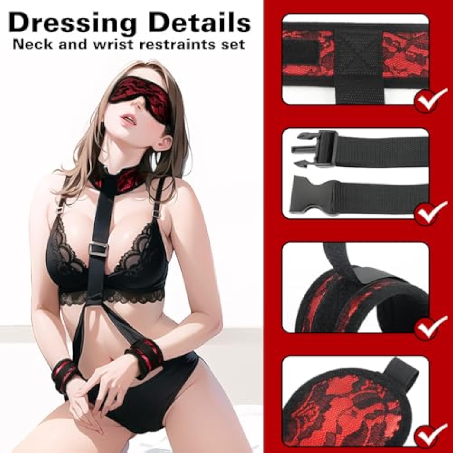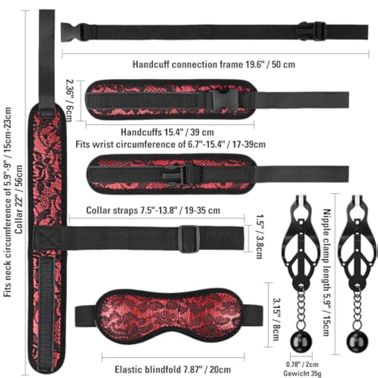 | ?4 Pcs Bdsm Bondage Gear Accessories?Sm Sex Set Includes Handcuffs, Collar, Nipple Clamps And Blindfold. This Couples Bondage Kit Is Super Comfortable And Suitable For Both Beginners And Experienced Sm Players, Ignite A Night Of Passion With Your Loved One Through Role Play And Have A Night Of Joy (Or Misery). | | ?Comfortable Portable Adult Sex Toy Bondage Set?The Eye Mask Collar Handcuffs Are Made Of High-Quality Nylon, Sponge, And Asb, Lace Design Makes The Toy More Charming. The Skin-Friendly And Soft Texture Is Suitable For Long-Term Wear. The Nipple Clamps With Weighted Balls Are Made Of High-Quality Metal, Making The Toy More Challenging. | | ?Multiple Combination Sm Sex Toy?The Sex Toy Set Provides A Variety Of Ways To Play! For Example: Couple Handcuffs Tie The Wearer'S Arms In Front Or Behind, Expose The Chest, Use Nipple Toys To Squeeze The Nipples Or Stretch The Labia For Fun. For Example, Cover Your Eyes With A Beautiful Eye Patch And Your Lover Will Focus More On You. | | ?Adjustable Restraint Set For Easy Installation And Removal?The Padded Handcuffs And Collar Have Adjustable Velcro, You Can Enjoy Different Levels Of Restraint After Connecting The Buckles Of The Handcuffs To The Extension Straps And Adjusting Them According To Actual Needs, Taking Bdsm Gaming To The Next Level Again. | | ?Privacy Delivery?We Clearly Know That Privacy Is Crucial To Every Consumer! Our Neutral Packaging And Delivery System Allows You To Shop With Confidence Without Exposing Any Information. We Check Product Details Before Sale To Ensure You Receive Your New Sex Toy. | |
