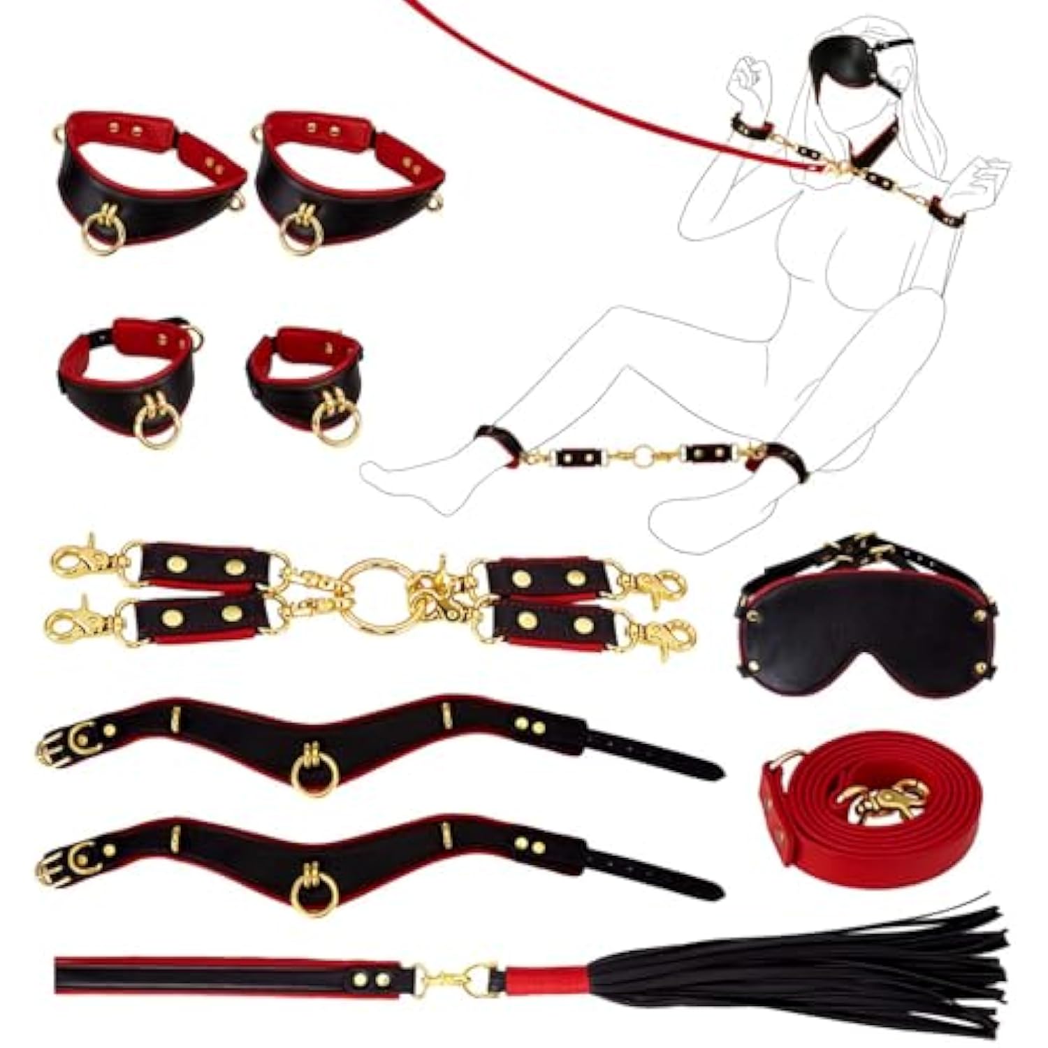 Sex Bondage Bdsm Kit Restraints 7Pcs Sets With Adjustable Handcuffs Collar Blindfold Cross Strap Whip Adult Sex Toys For Men Women And Couples | Black And Red With Storage Bag