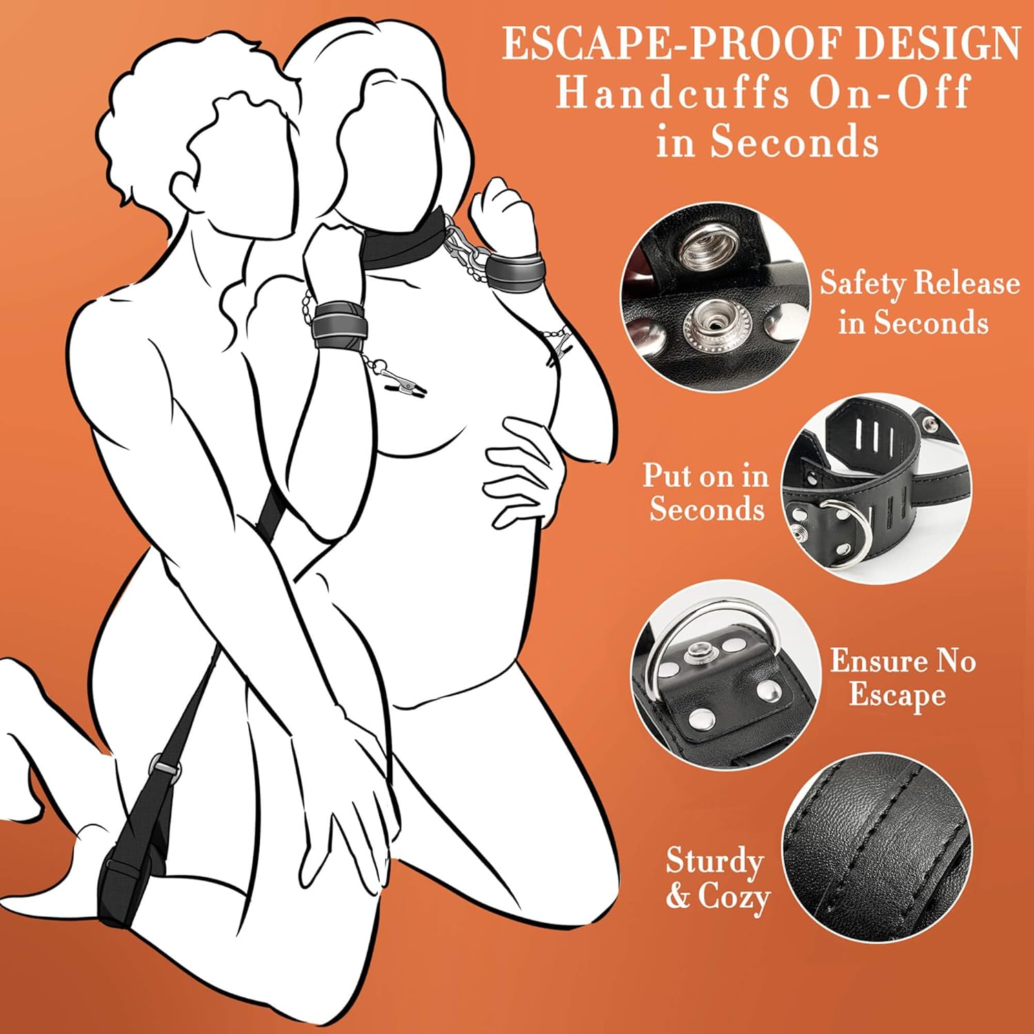 Innovative Design, Custom Fit β Featuring mid-cuff openings to prevent excess strap hanging, these handcuffs ensure easy wear and removal. Adjustable from 5.5" to 10.5", they offer a secure fit for most wrist sizes. Heavy-duty snaps provide a firm lock while allowing a quick release for safety.
