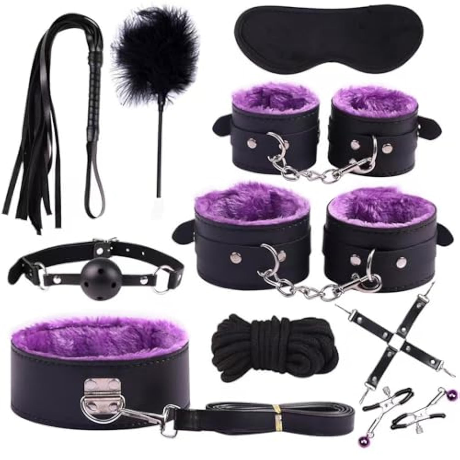 Sex Bondage Kits, Bdsm Restraint Toys 10 Pcs, Handcuffs, Ankle, Cuffs, Clamps, Ball Gag, Blindfold, Rope, Leather, Restraints Set, Sm Beginner Role Play Toy, Bdsm Kits (Purple-10Pcs)