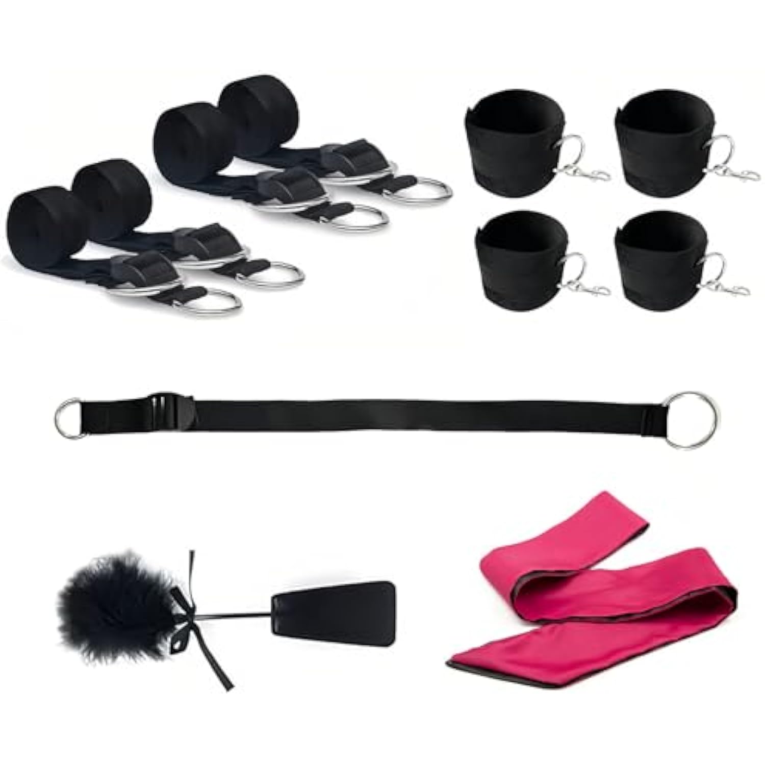 - 8Pcs Bed Bondage Restraints Bdsm Kit - This Sex Bondage Set Contains Adjustable Straps*4, Cuffs*2, Blindfold*1, Feather Tickler Paddle*1. The Complete Bdsm Sex Toys Set Is Also Featured With Multiple Using Ways, Such As Separately Body Bondage Play, Bed