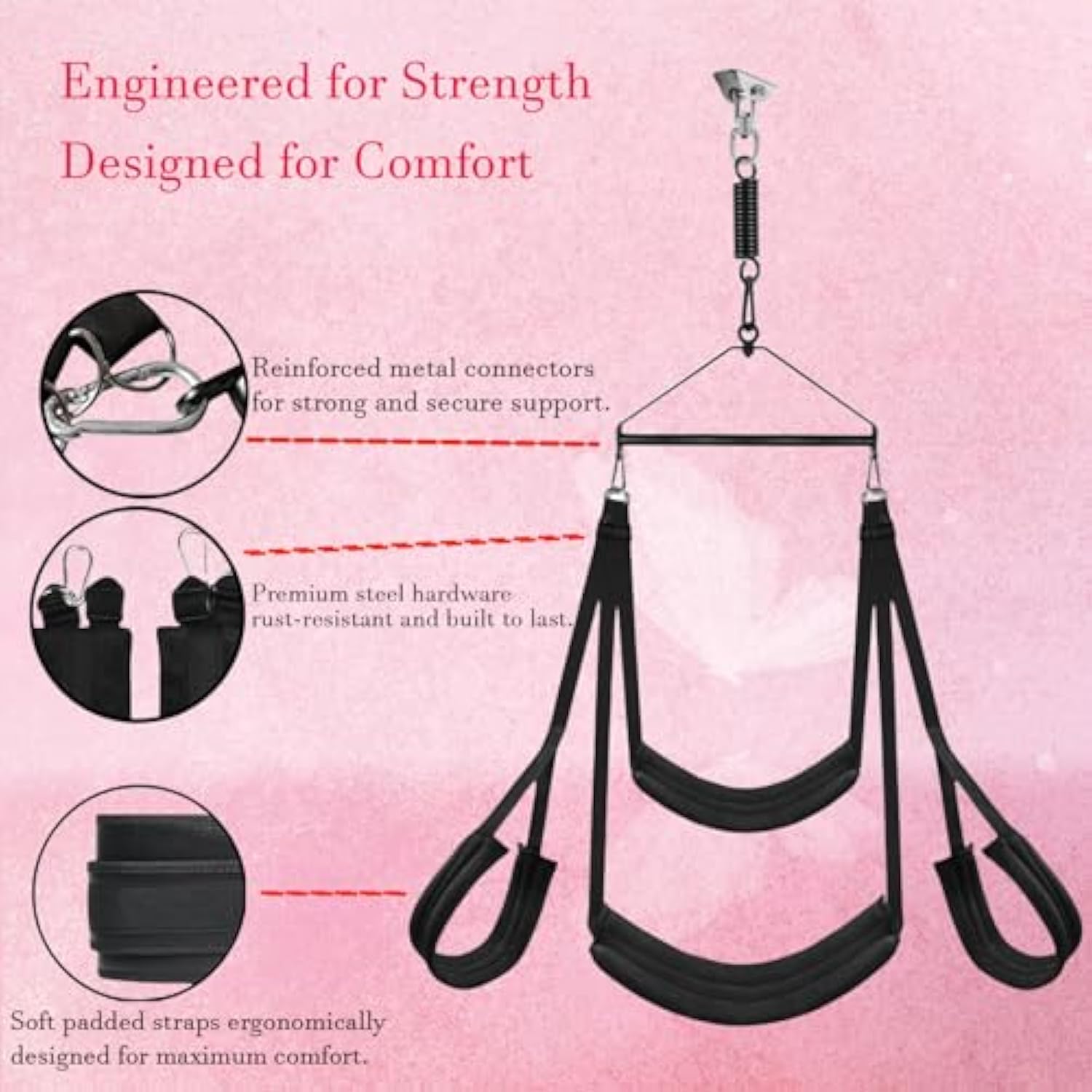 | 360° Rotating Design For Unlimited Possibilities-Enjoy Full-Body Access And A Wider Range Of Motion With The 360-Degree Rotating Feature. This Spinning Swing Allows Couples To Explore New Positions And Experiences That Aren’T Possible On A Bed Or Sofa—Ideal For Enhancing Connection, Creativity, And Intimacy. | | Exciting Adventurous Bedroom Play-Bring Thrilling Variety To Your Intimate Moments. The Spinning Motion Combined With Slight Restraint Adds A Playful Bondage Element, Elevating Your Experience With A Sense Of Adventure, Fun, And Excitement. | | Comfortable, Durable Materials-Made With Soft Cotton Fabric And Heavy-Duty Nylon Straps, The Swing Is Designed For Long-Lasting Use And Maximum Comfort. Whether You'Re Using It For Pleasure Or Relaxation, It’S Gentle On The Body While Being Strong Enough To Support Intense Sessions. | | Enhanced Anti-Slip Buckle Dual Installation Options-The Upgraded Swing Hook Features A Secure Anti-Slip Adjustment Buckle And Includes Two Types Of Screws, Making It Compatible With Both Concrete And Wooden Structures. Built For Superior Stability And Comfort, It Outperforms Cheaper Alternatives In Both Safety And Durability. The Swing Hook Supports Up To 1200 Lbs, And The Swing Rope Handles Up To 800 Lbs. | | Private Secure Packaging-Shipped In A Plain, Unbranded Kraft Paper Box To Ensure Complete Discretion. Your Privacy Is Fully Protected—No One Will Know What’S Inside. | |
