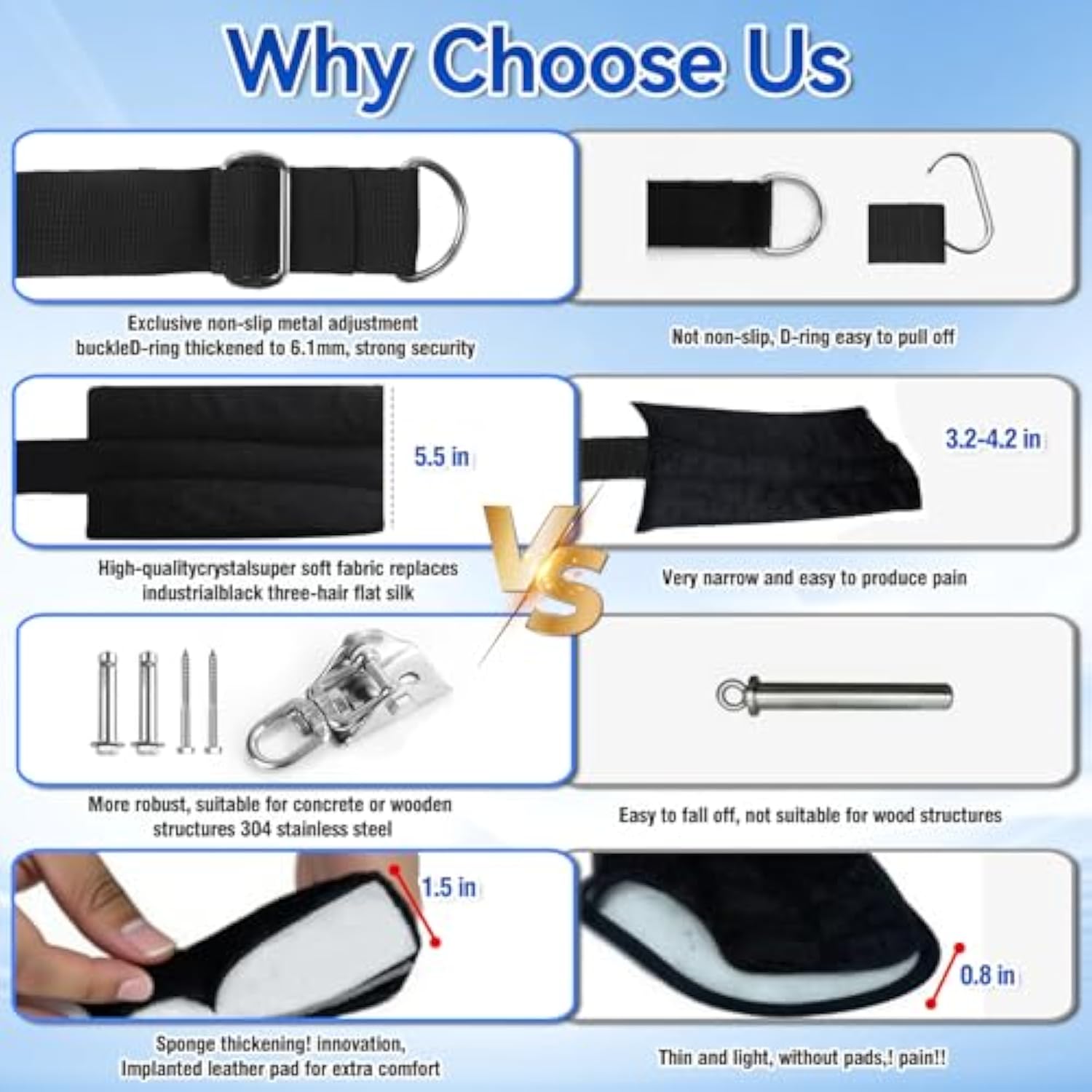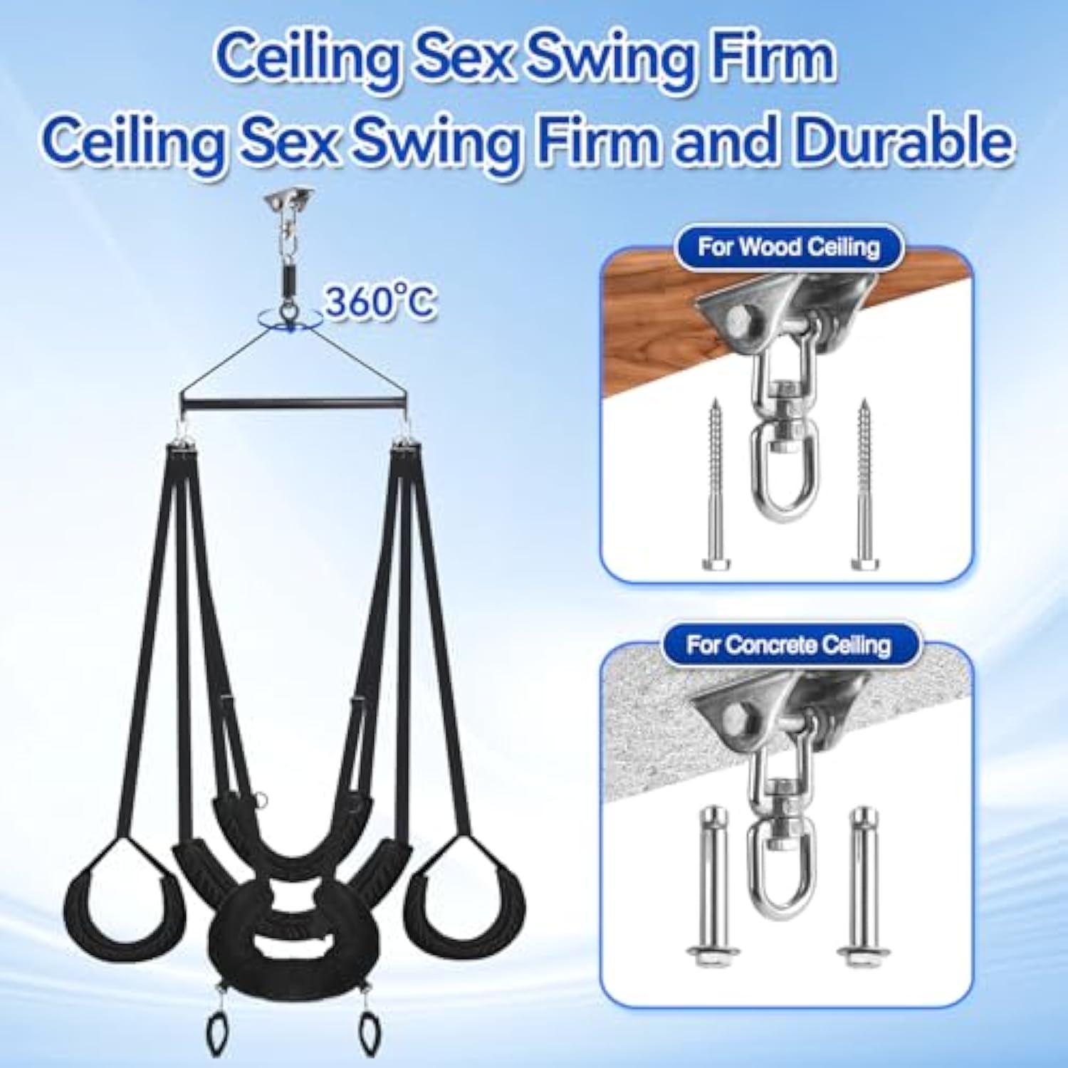 | 360° Rotating Ceiling Secure Reliable Mount : Equipped With A High-Strength Ceiling Fastener, This Sex Swing Allows For Smooth, Unrestricted 360-Degree Rotation, Ensuring Stability And Durability For Worry-Free Enjoyment. | | Ultimate Comfort Restraint – U-Shaped Pillow Detachable Handcuffs: Designed For Both Comfort And Excitement, This Set Includes A Soft U-Shaped Pillow And Detachable Handcuffs, Offering Enhanced Support While Catering To Advanced Play Preferences. | | Widest Thickest Cushion: Superior To Market Standards, Unlike Standard Swings, Our Model Features The Widest And Thickest Cushion Available, Providing Unparalleled Comfort And Durability For An Elevated Experience. | | Premium Materials For Safety Comfort: Crafted From Durable Leather And Strong Nylon, This Bondage Gear Supports Intense Play With Excellent Weight-Bearing Capacity. The Soft Sponge Padding Ensures A Skin-Friendly Experience, Reducing Pressure And Preventing Irritation During Extended Use. | | Quick Easy Setup: Designed To Fit Most Standard Doors, This Swing Can Install On The Wood Ceiling And Concrete Ceiling In Several Minutes With Tools And Drilling. Enjoy Hassle-Free Setup And Removal, Hanging From The Ceiling Brings You Infinite Joy. | | No Worry : We Are Committed To Providing Excellent