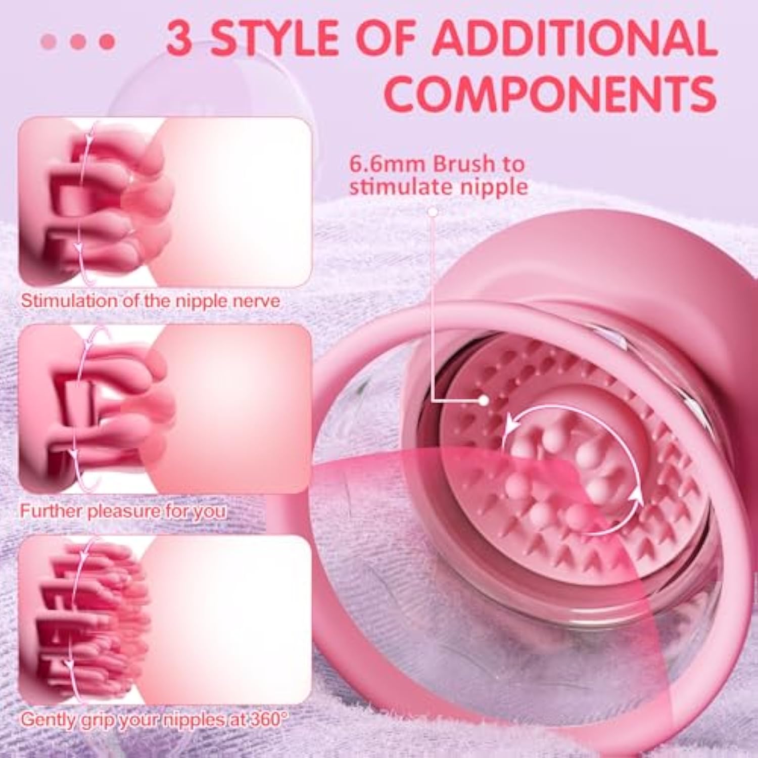- ?3 Interchangeable Exclusive Brush Heads And Targeted Stimulation? Enjoy Personalised Pleasure With 3 Exclusive Interchangeable Brush Heads And Targeted Stimulation.The First 1 Can Wrap Your Nipple 360°, Like Gently Sparing Your Nipple.The Second 1 Can Reach Your Nipple Point Any Angle, So That You Can Release Your Desire.The Third 1 Is An Upgraded Version Of The First 1, Which Has A Thicker Line Than The First 1 To Better Massage Your Nipples.