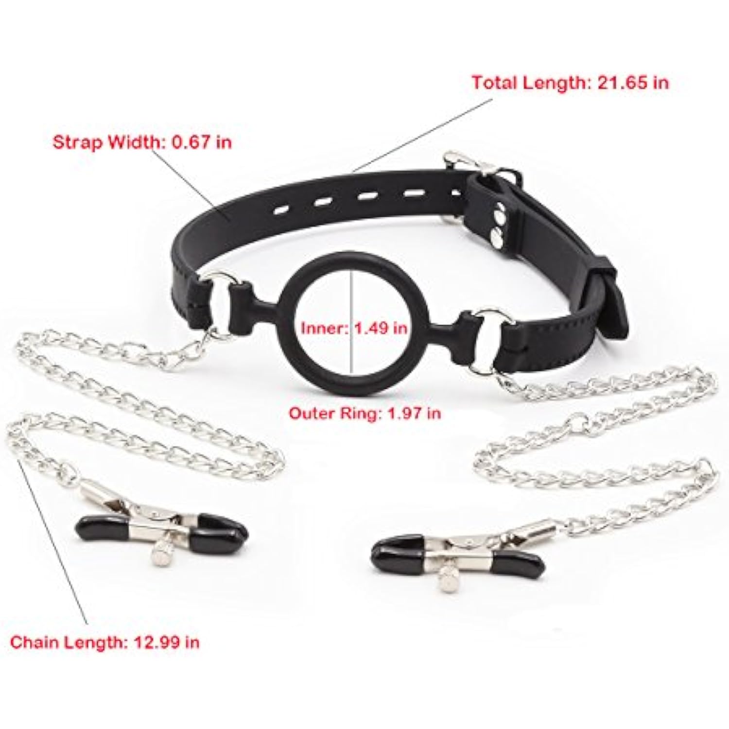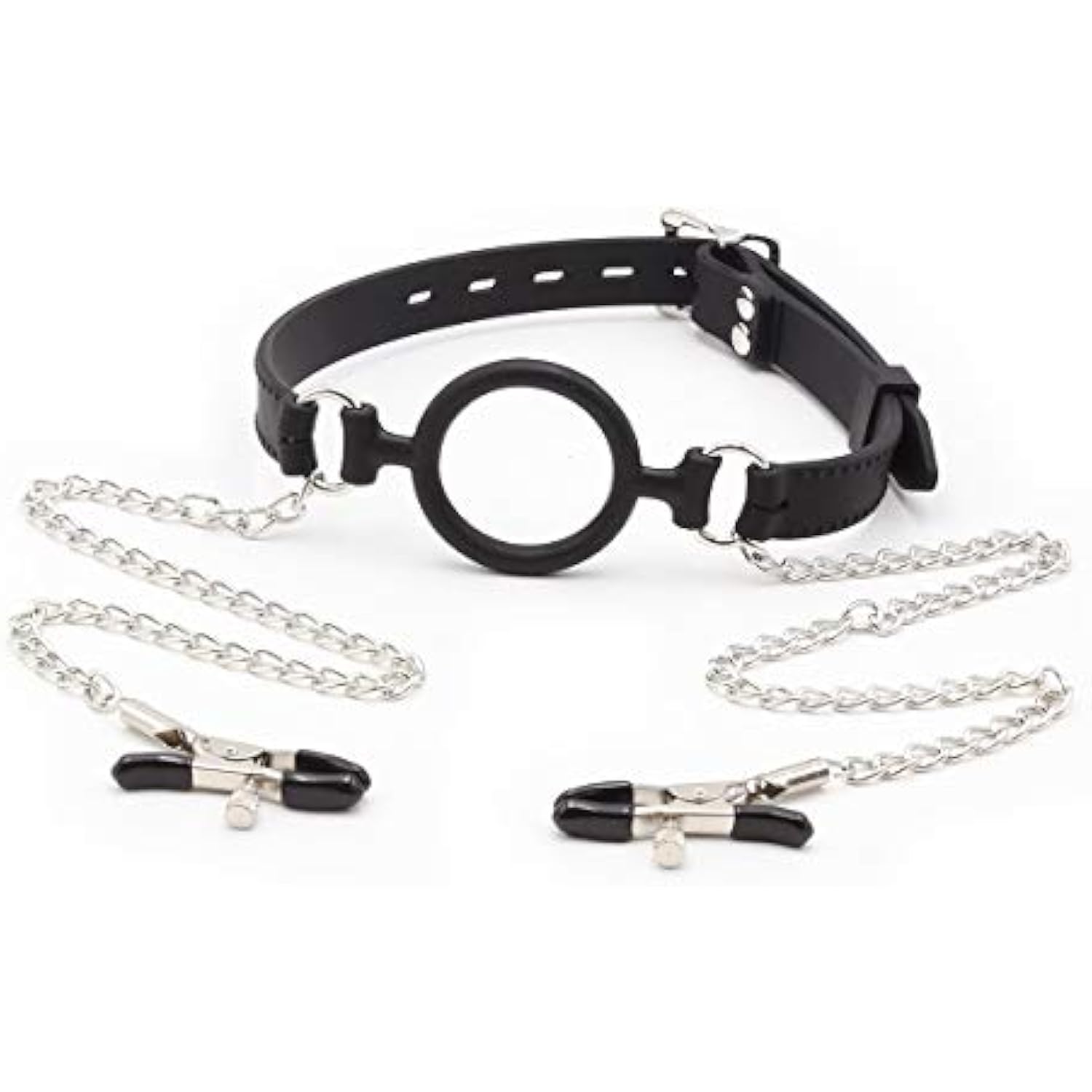 Silicone Ball Gag O Ring Open Mouth Gag Adjustable Strap Bondage Harness Restraints (Black W/Nipple Clamps)