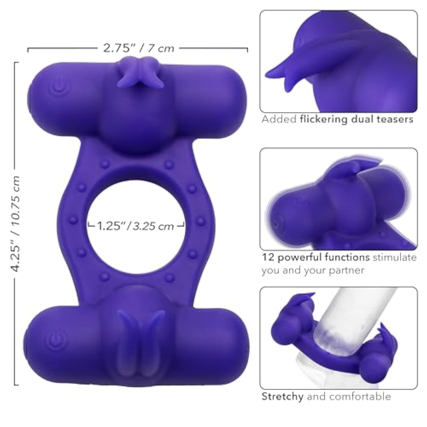 Stretchy And Comfortable Vibrating Silicone Couples Enhancer With Flickering Dual Teasers And Dual Independent Motors | | 12 Intense Functions Of Vibration, Pulsation And Escalation | | Enhances Stimulation For You And Your Partner | | Memory Chip Resumes On Last Function Used; Security Travel Lock Feature – Hold For 3 Seconds To Turn On Or Off | | Usb Rechargeable – Dual Charging Cord Included; Complete Charge In 1.5 Hours (Each Motor); Runs For 55 Minutes On High Speed And 80 Minutes On Low Speed (Each Motor); 1-Year Manufacturer | |