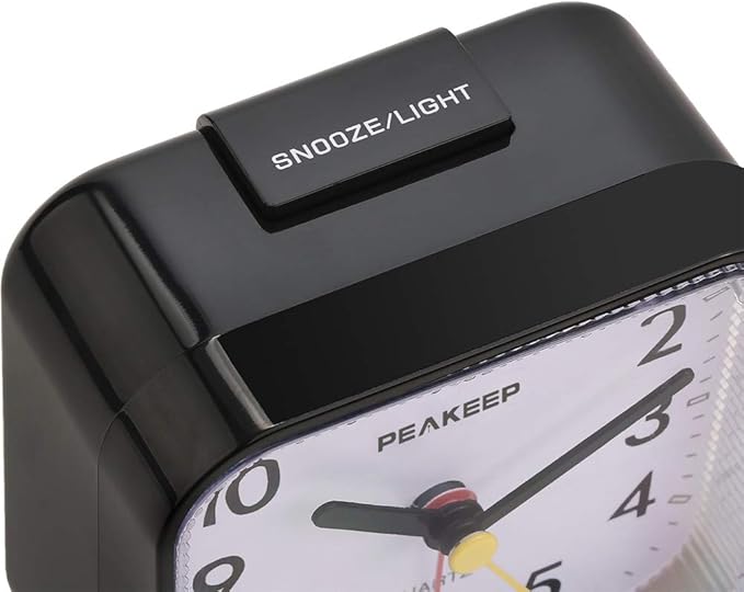 Small Battery Operated Analog Travel Alarm Clock Silent No Ticking, Lighted on Demand and Snooze, Beep Sounds, Gentle Wake, Ascending Alarm, Easy Set (Black)