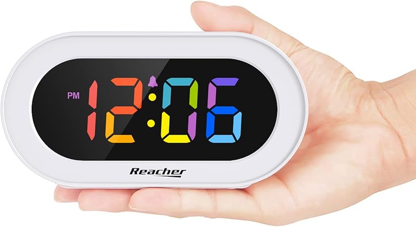 Small Colorful LED Digital Alarm Clock with Snooze, Simple to Operate, Full Range Brightness Dimmer, Adjustable Alarm Volume, Outlet Powered Compact Clock for Bedrooms, Bedside, Desk, Shelf