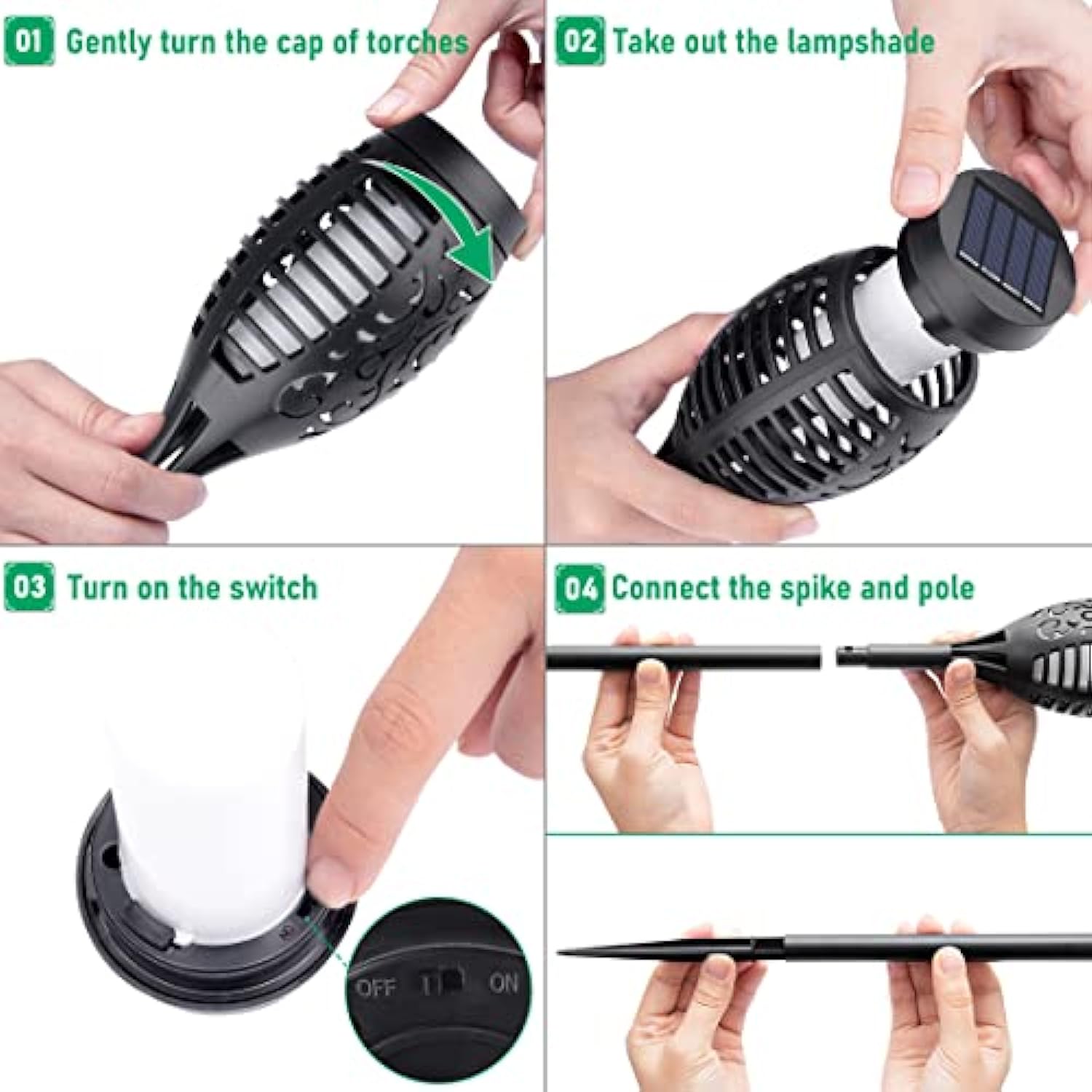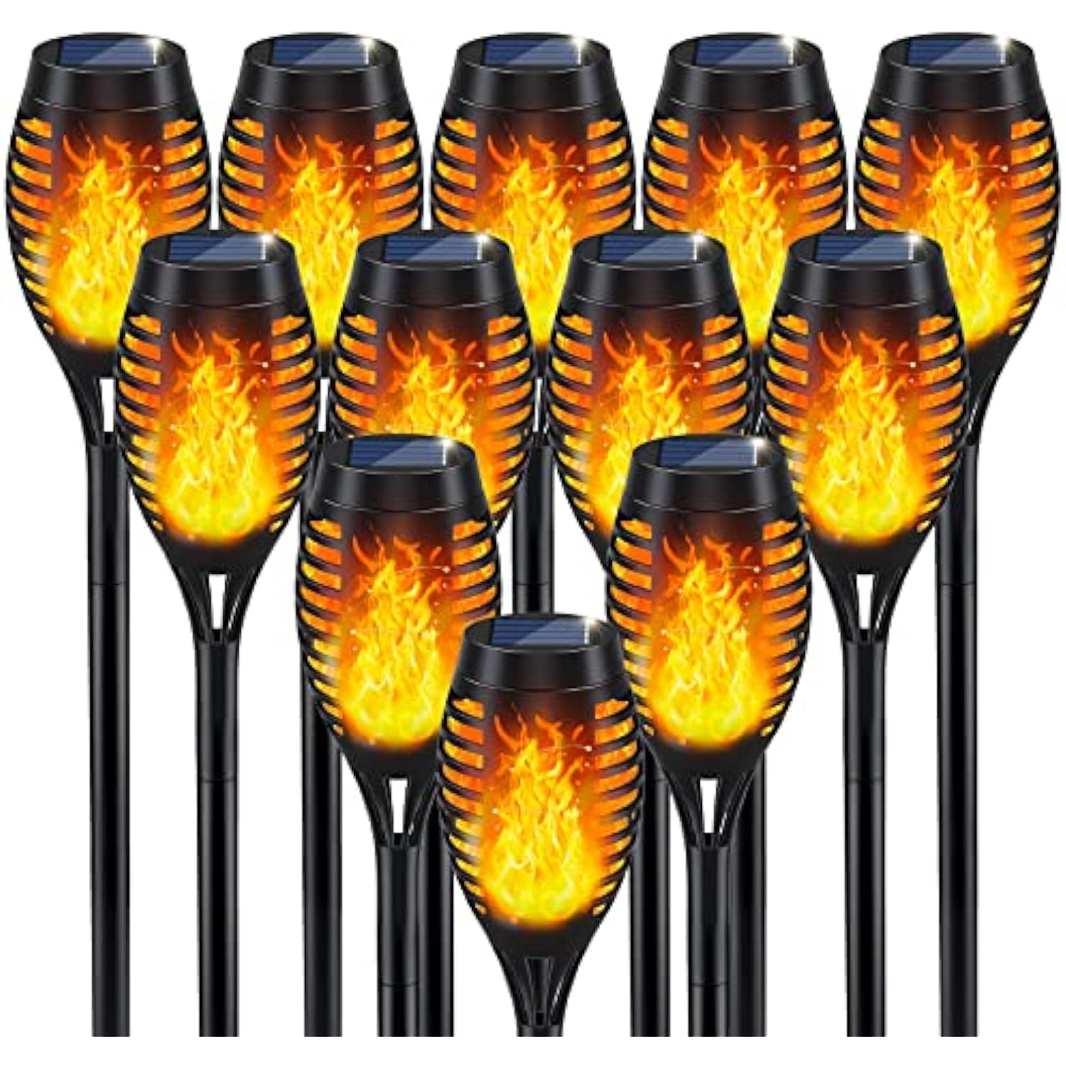 - FLICKERING FLAMES TORCH LIGHTS: Small solar outdoor lights cast a lovely warm glow like flickering flame, a safe alternative to the real “flames”. Solar torch lights are perfect outdoor decorations for patio, garden, porch, yard, pathway, making your yard stand out in the community.