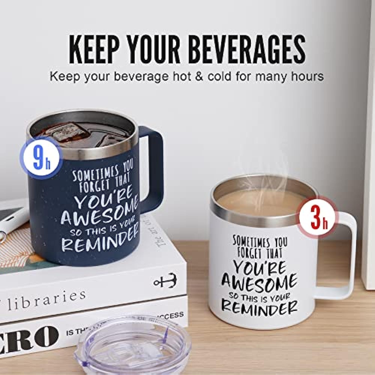 - Keep Cold & Hot for Long Time: The mug has a vacuum insulation layer, which can keep beverage cold for 6-12 hours and hot drinks for 0-6 hours. The lid fits tight in the mug. The slide button design of lids protect against splashes and is convenient for straw and sipping.